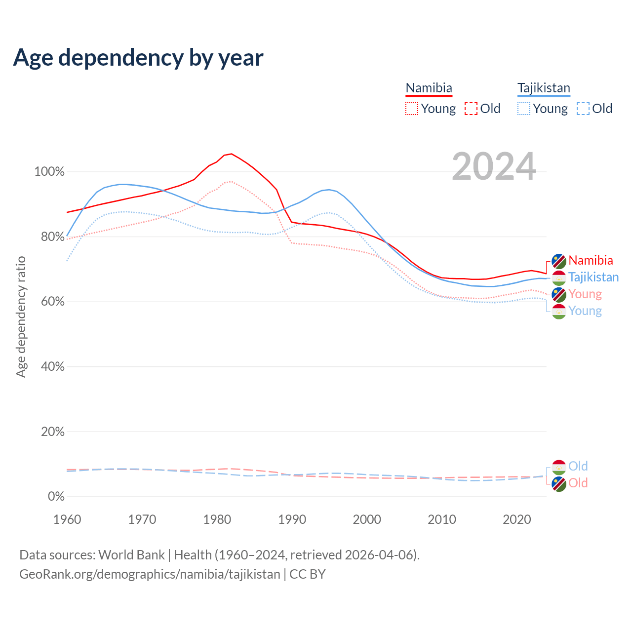 - The share of old-age demographic (65+) in Namibia is 3.67% vs 3.85% in Tajikistan.