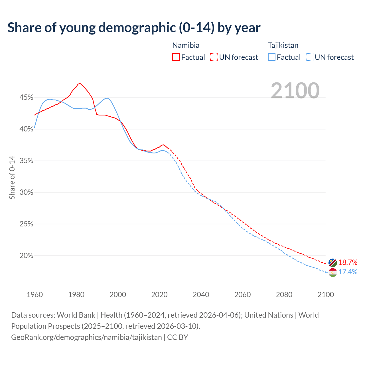- The share of young demographic (0-15 years old) in Namibia is 37% vs 36.3% in Tajikistan.