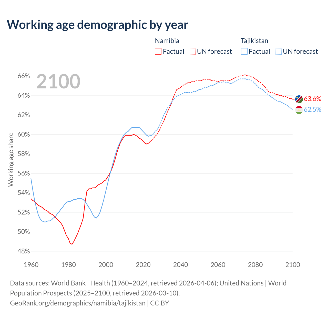 - Namibia has 1.88M working age adults (aged 15-64) vs 6.61M in Tajikistan.