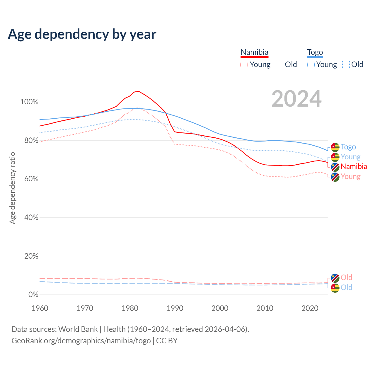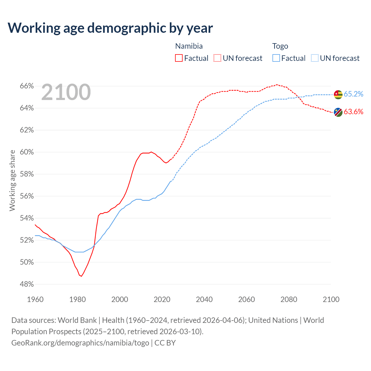 The share of older people aged 65 and over is 3.67% in Namibia and 3.21% in Togo. Life expectancy in Namibia compared to Togo .