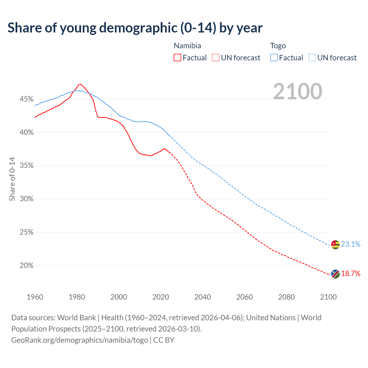 Median age Namibia vs Togo, 1960-2100