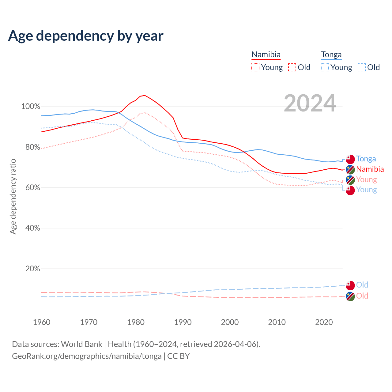 Data sources: World Bank | Health (1960–2024, retrieved 2026-04-06); U.S. Census Bureau (1960–2024, retrieved 2026-02-08).