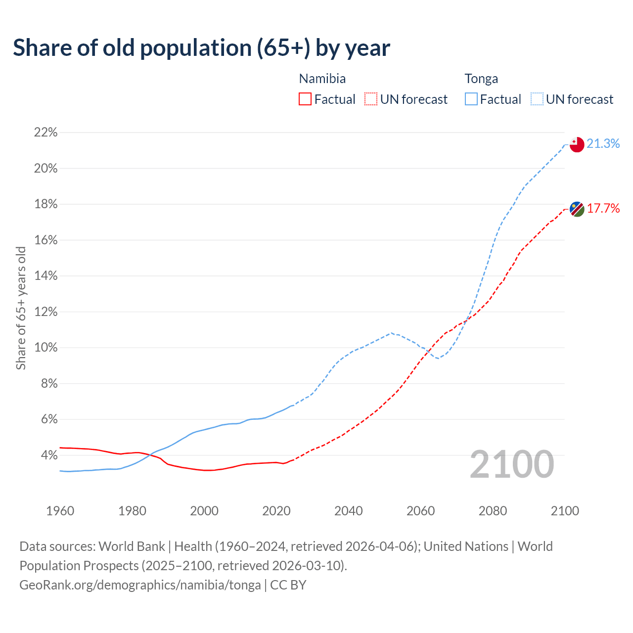 The share of older people aged 65 and over is 3.67% in Namibia and 6.72% in Tonga. Life expectancy in Namibia compared to Tonga .