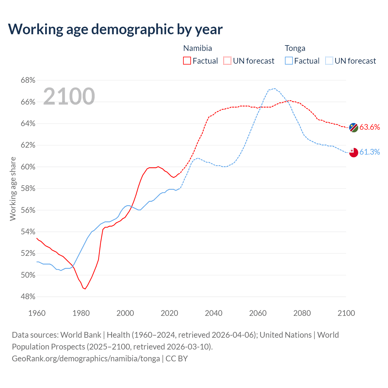 - Namibia has 1.88M working age adults (aged 15-64) vs 59.8K in Tonga.