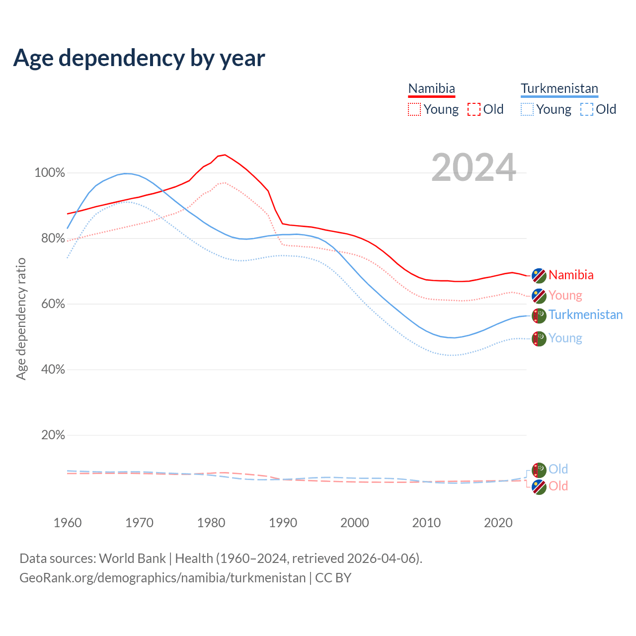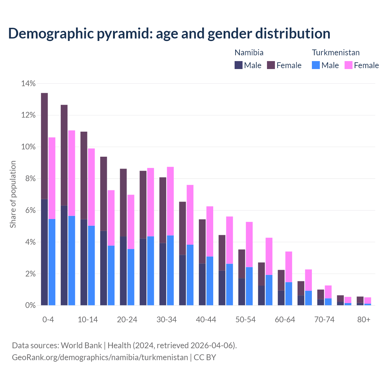 - Namibia is ranked 147/196 by median age (oldest to youngest) vs 119/196 for Turkmenistan.
