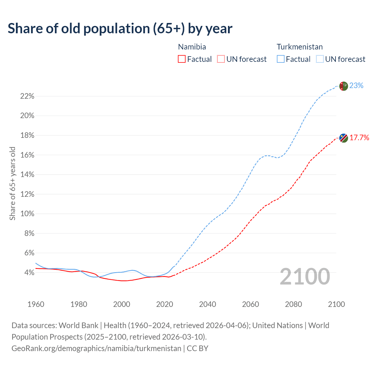 The share of older people aged 65 and over is 3.67% in Namibia and 4.53% in Turkmenistan. Life expectancy in Namibia compared to Turkmenistan .