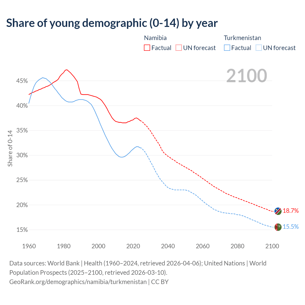 - The share of young demographic (0-15 years old) in Namibia is 37% vs 31.5% in Turkmenistan.