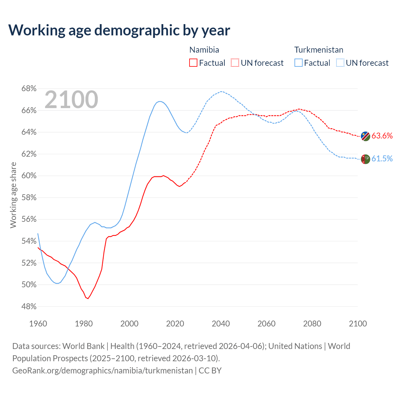 - Namibia has 1.88M working age adults (aged 15-64) vs 4.97M in Turkmenistan.