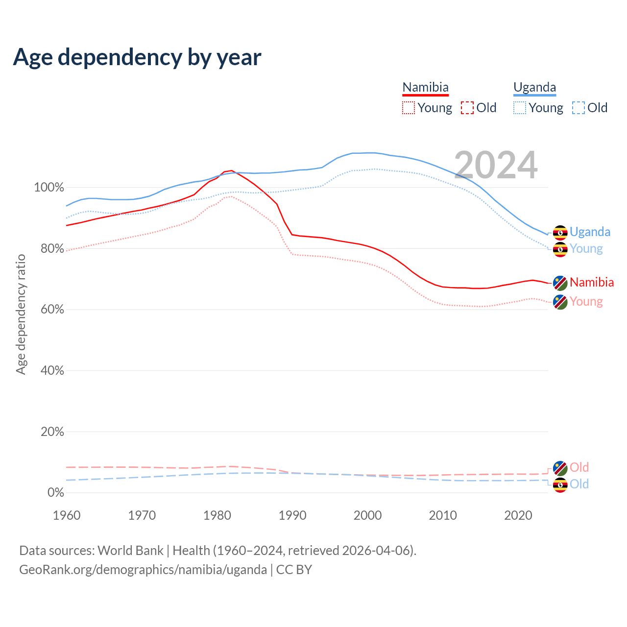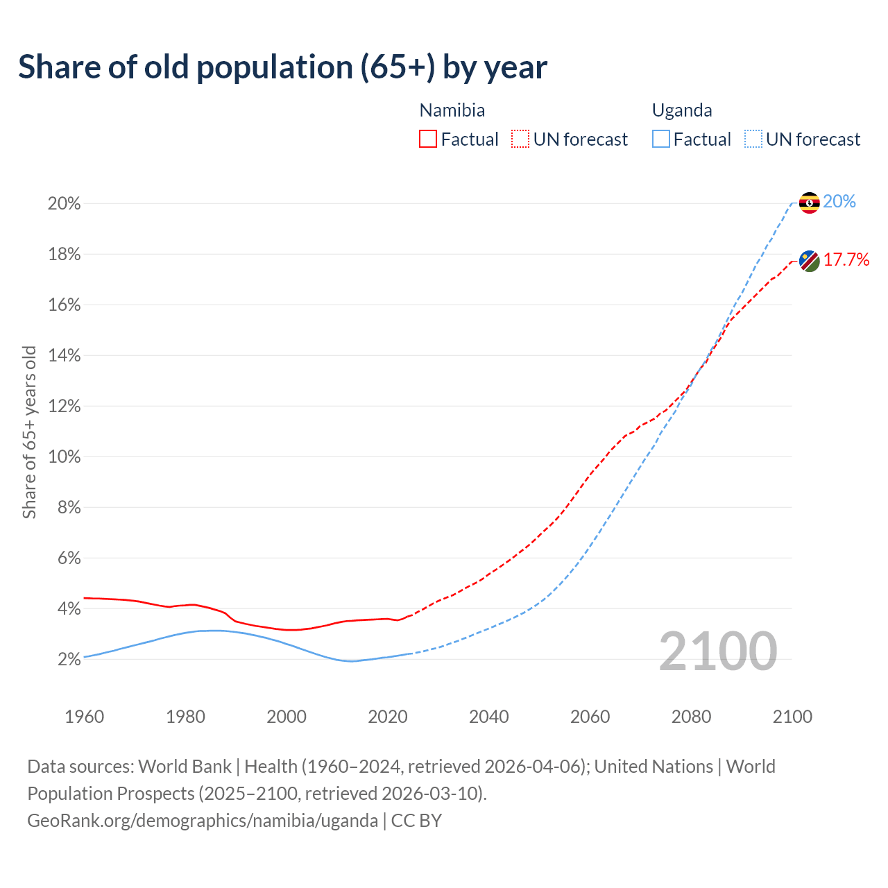 The share of older people aged 65 and over is 3.67% in Namibia and 2.19% in Uganda. Life expectancy in Namibia compared to Uganda .