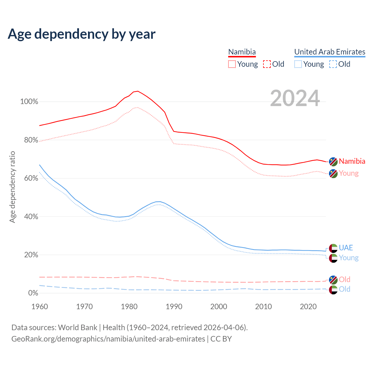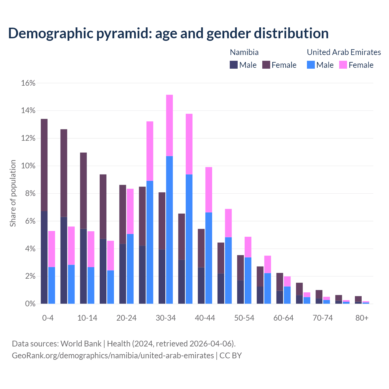 - Namibia is ranked 147/196 by median age (oldest to youngest) vs 91/196 for the United Arab Emirates.