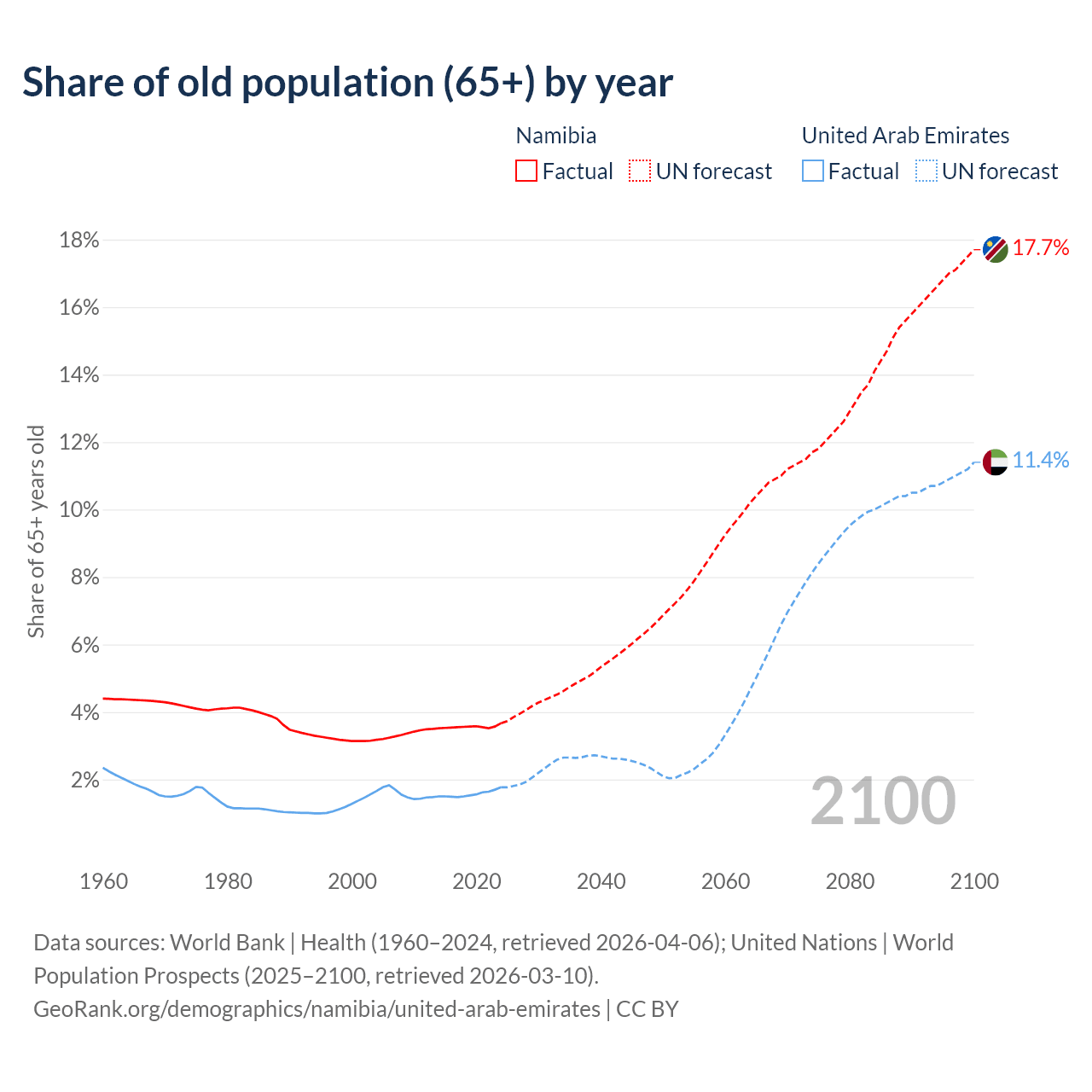 The share of older people aged 65 and over is 3.67% in Namibia and 1.77% in the United Arab Emirates. Life expectancy in Namibia compared to the United Arab Emirates .