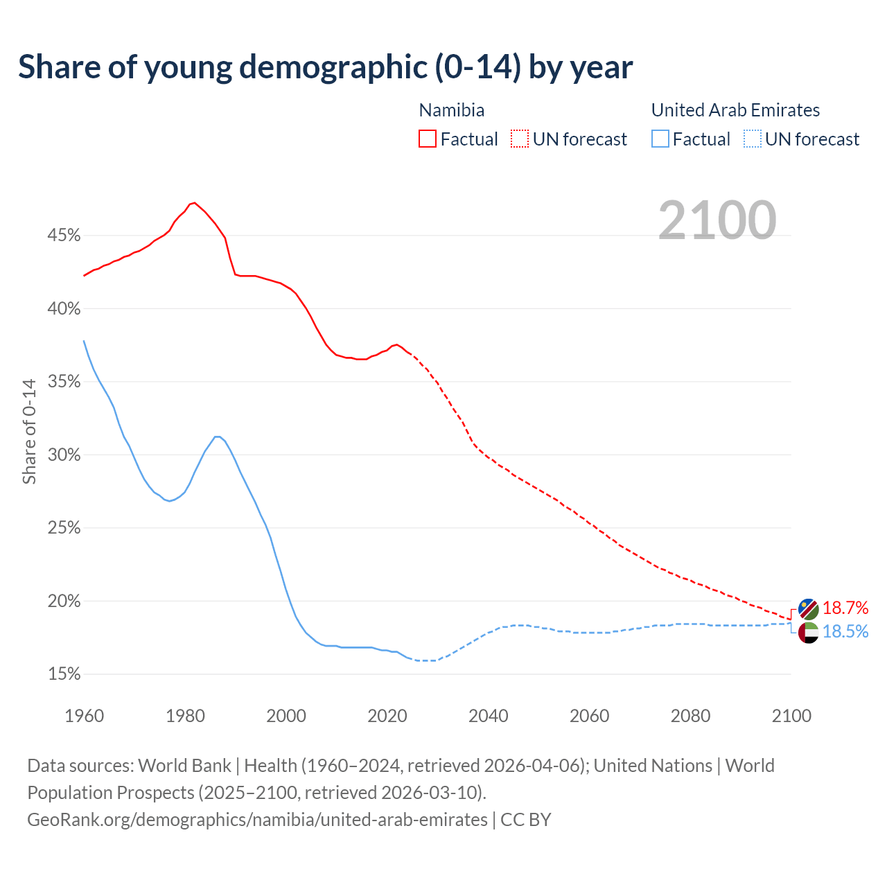 - The share of young demographic (0-15 years old) in Namibia is 37% vs 16.1% in the United Arab Emirates.