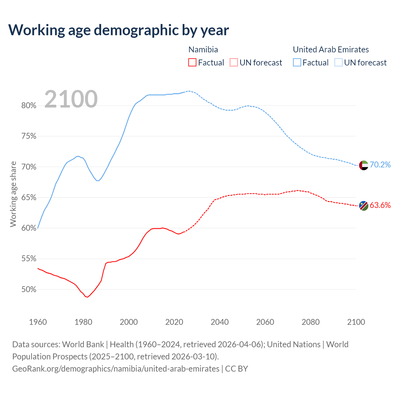 - Namibia has 1.88M working age adults (aged 15-64) vs 9.6M in the United Arab Emirates.