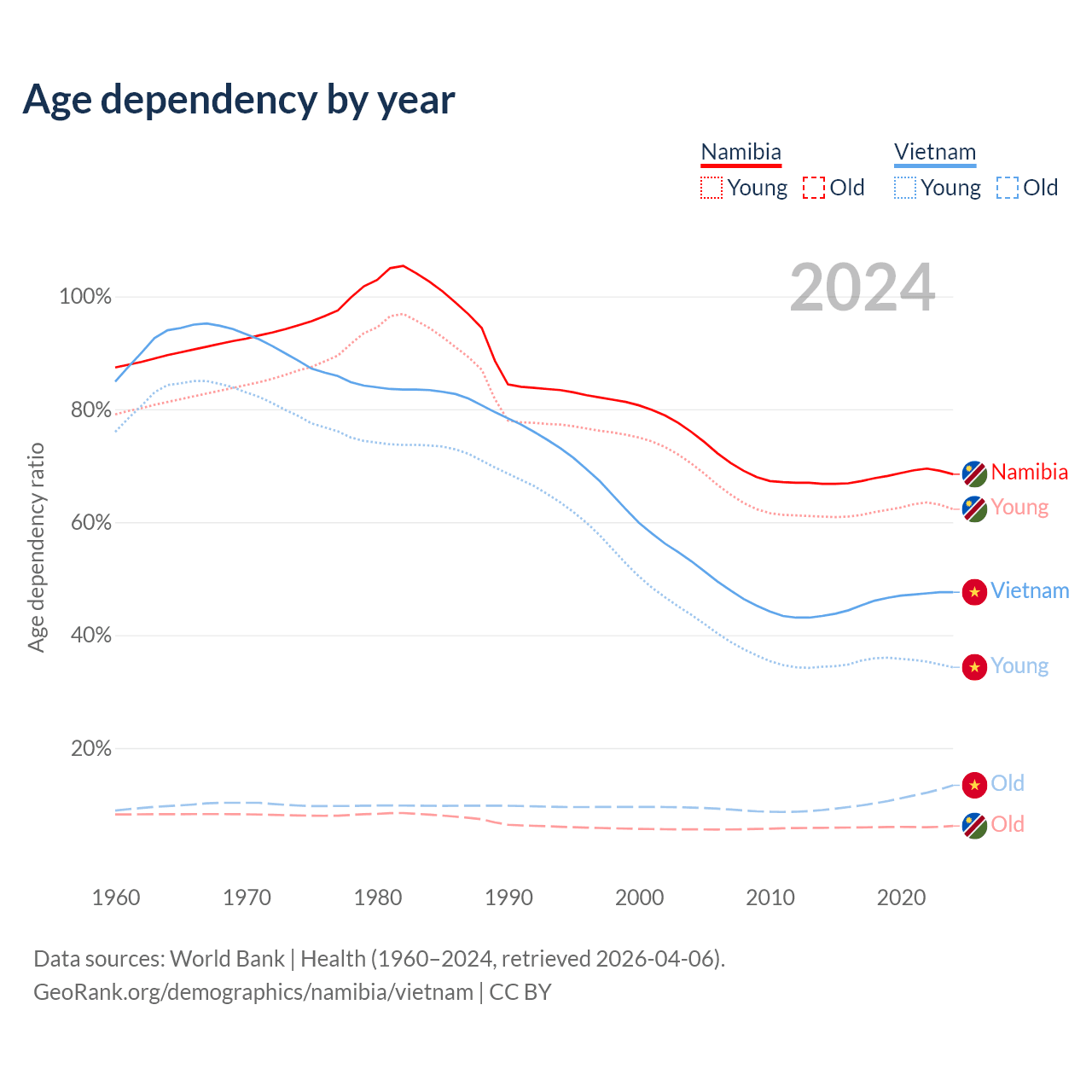 Data sources: World Bank | Health (1960–2024, retrieved 2026-04-06); U.S. Census Bureau (1960–2024, retrieved 2026-02-08).