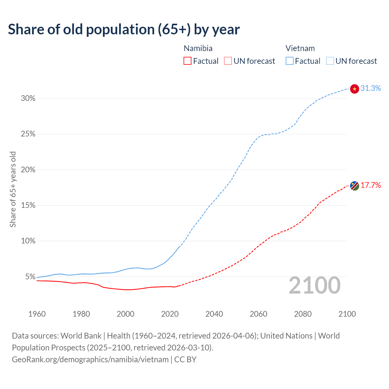 The share of older people aged 65 and over is 3.67% in Namibia and 9.05% in Vietnam. Life expectancy in Namibia compared to Vietnam .