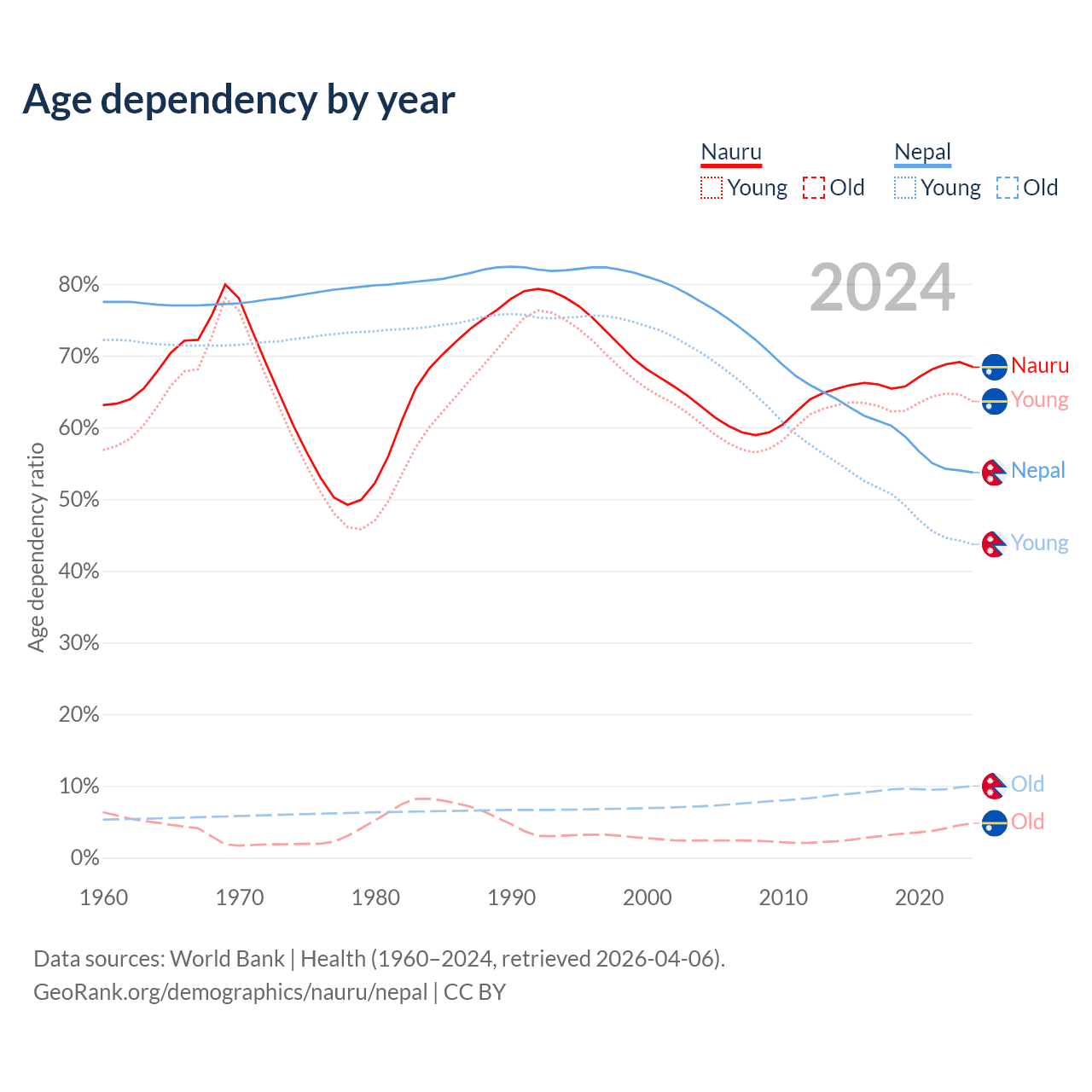 Data sources: World Bank | Health (1960–2024, retrieved 2026-04-06); U.S. Census Bureau (1960–2024, retrieved 2026-02-08).