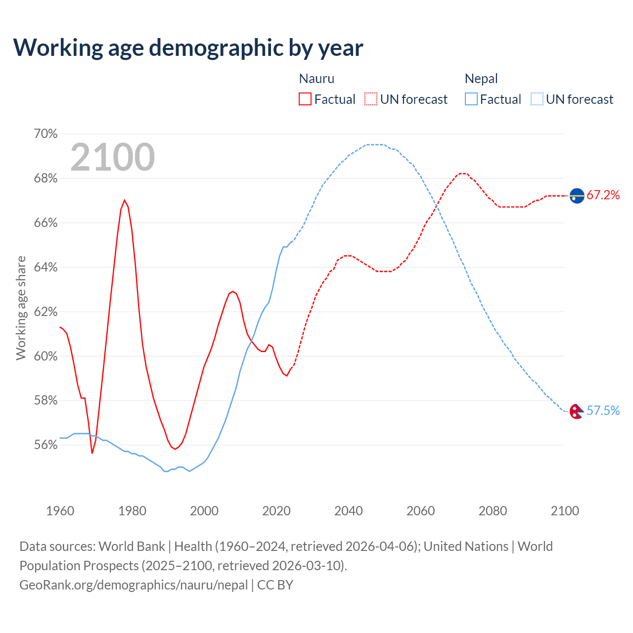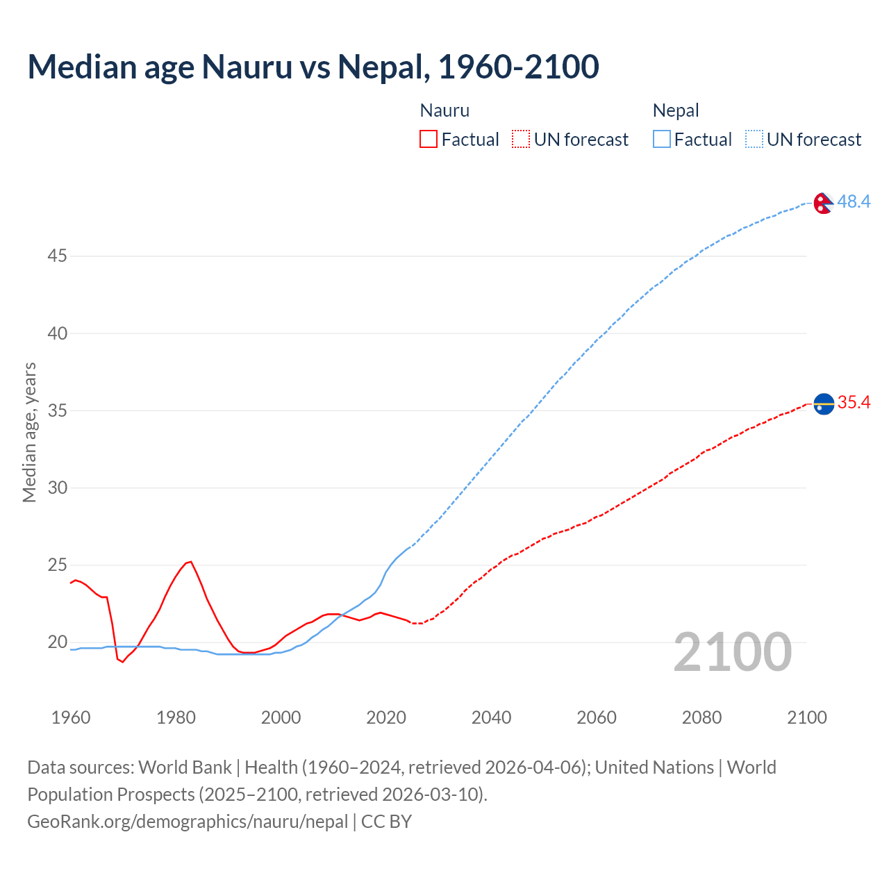 Median age Nauru vs Nepal, 1960-2100