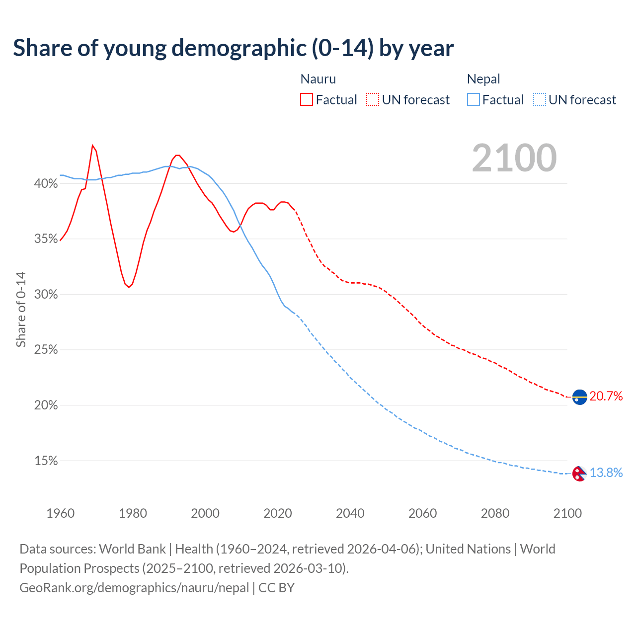 - The share of young demographic (0-15 years old) in Nauru is 37.8% vs 28.4% in Nepal.