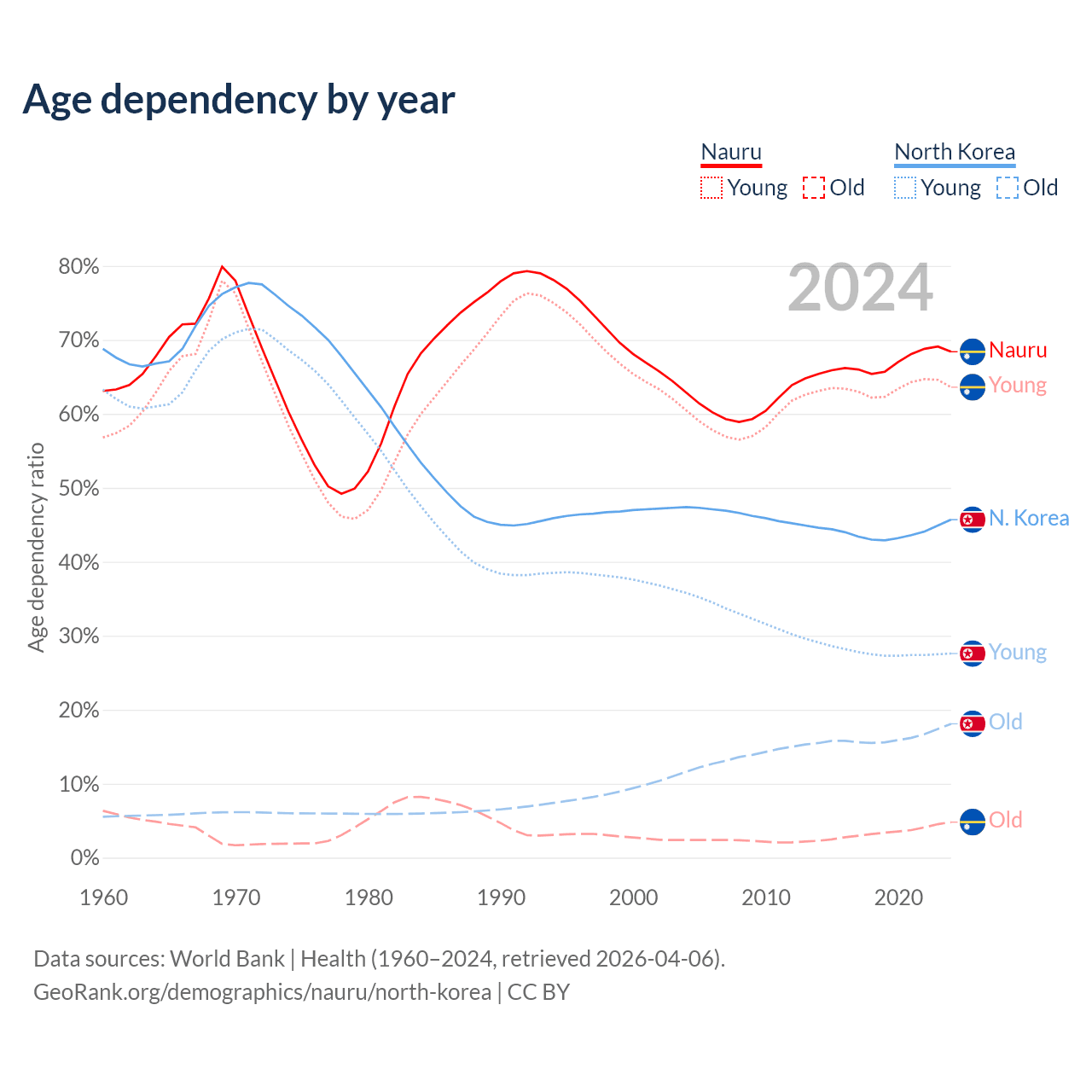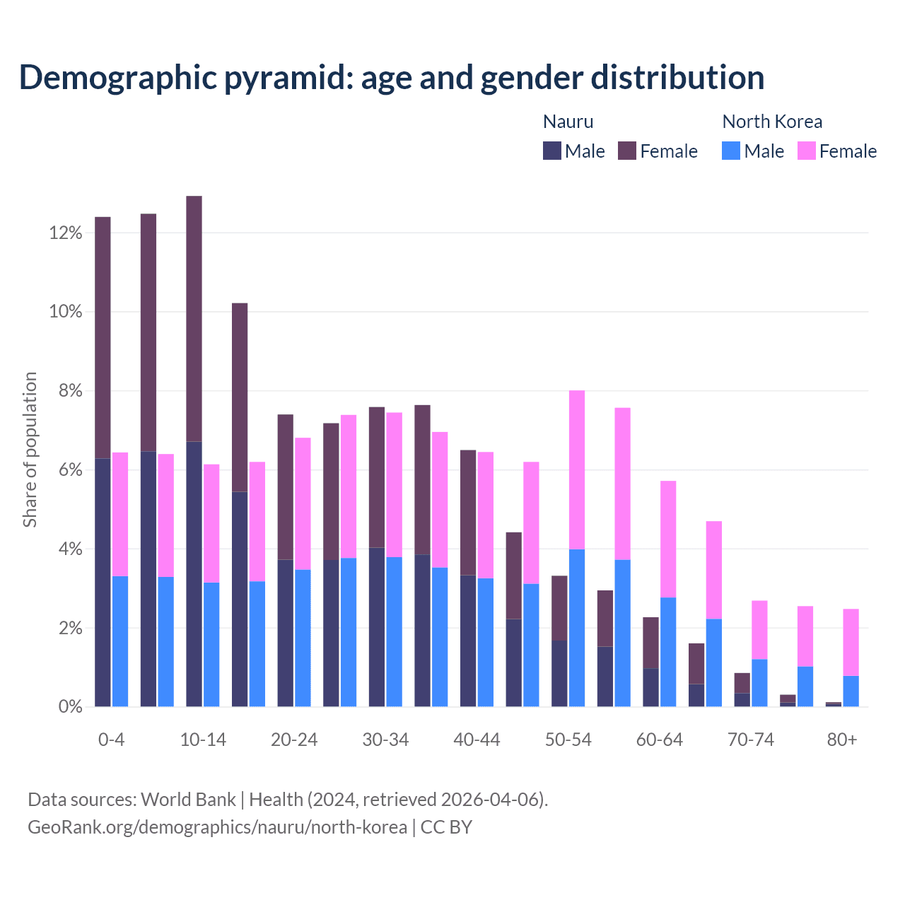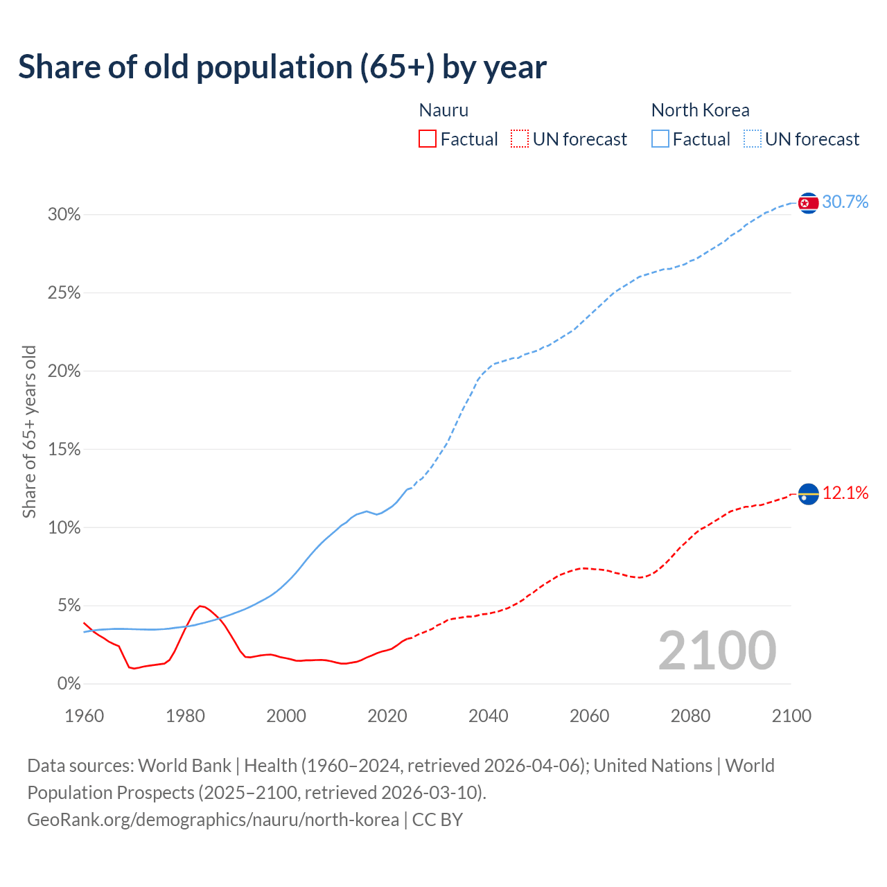 The share of older people aged 65 and over is 2.85% in Nauru and 12.4% in North Korea. Life expectancy in Nauru compared to North Korea .