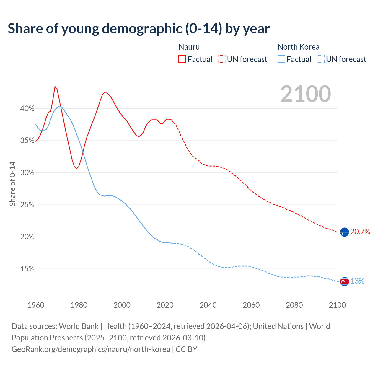- The share of young demographic (0-15 years old) in Nauru is 37.8% vs 18.9% in North Korea.