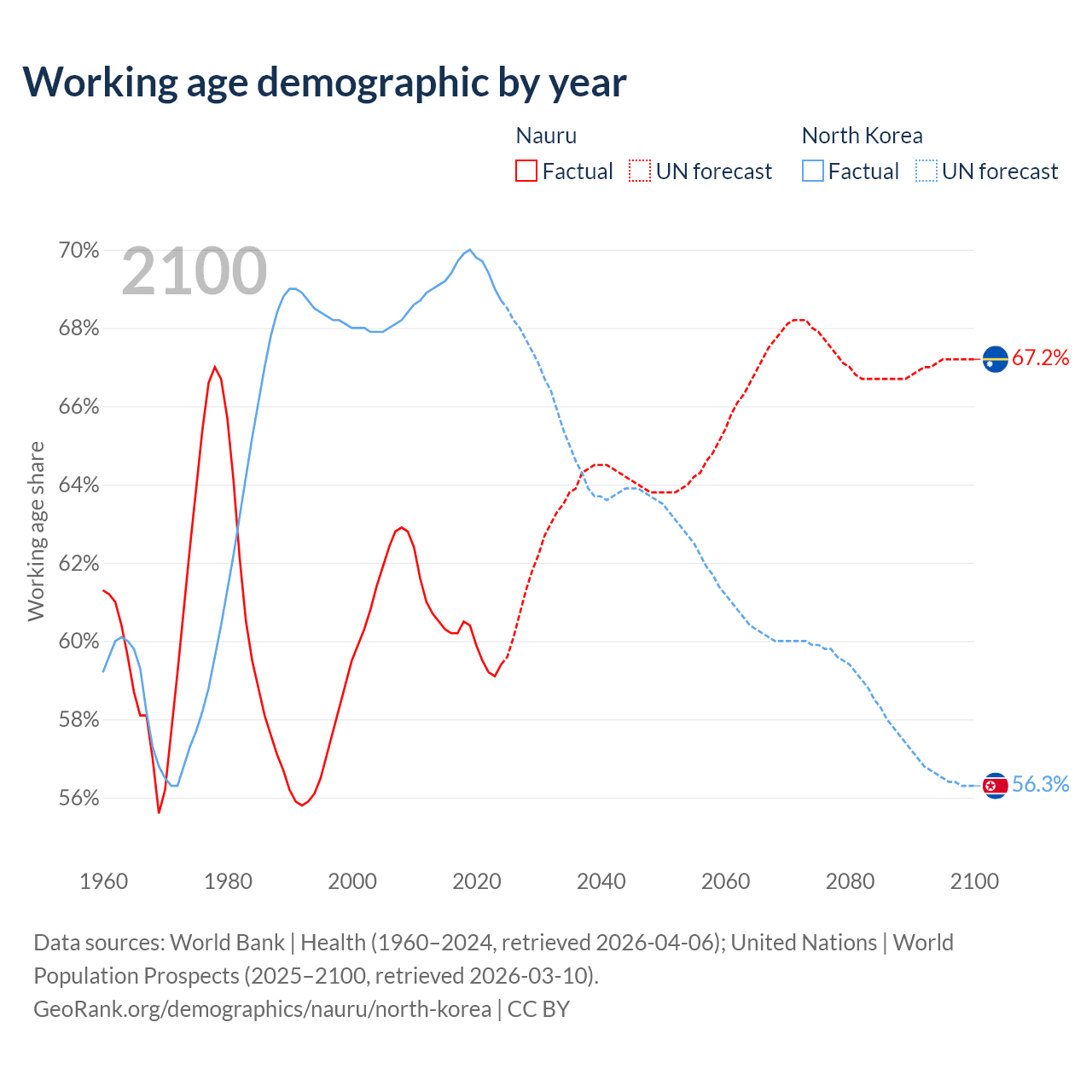 - Nauru has 7.2K working age adults (aged 15-64) vs 18.3M in North Korea.