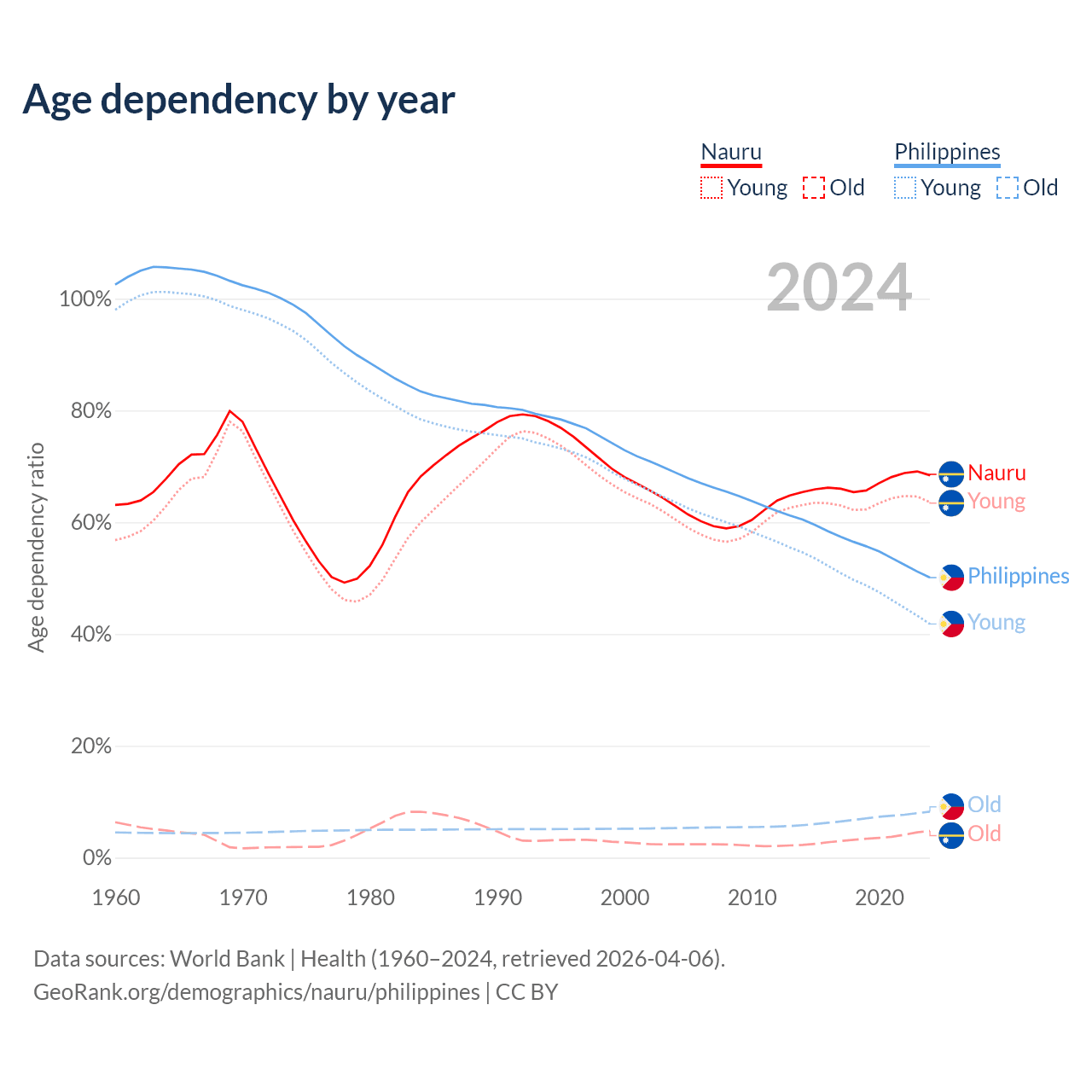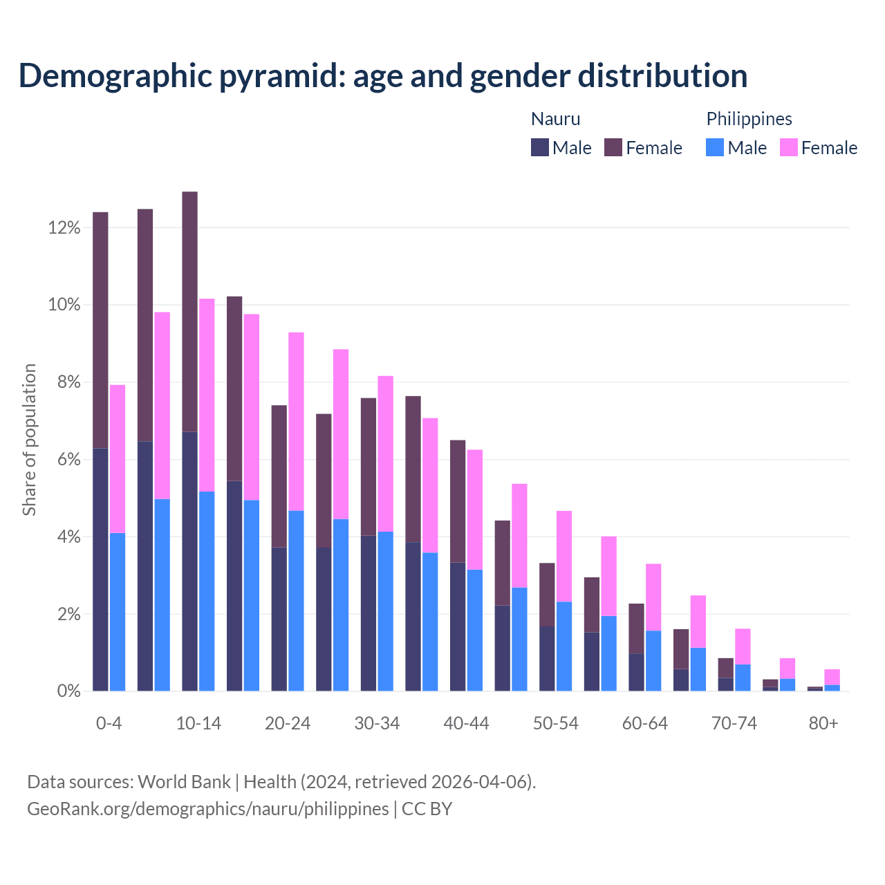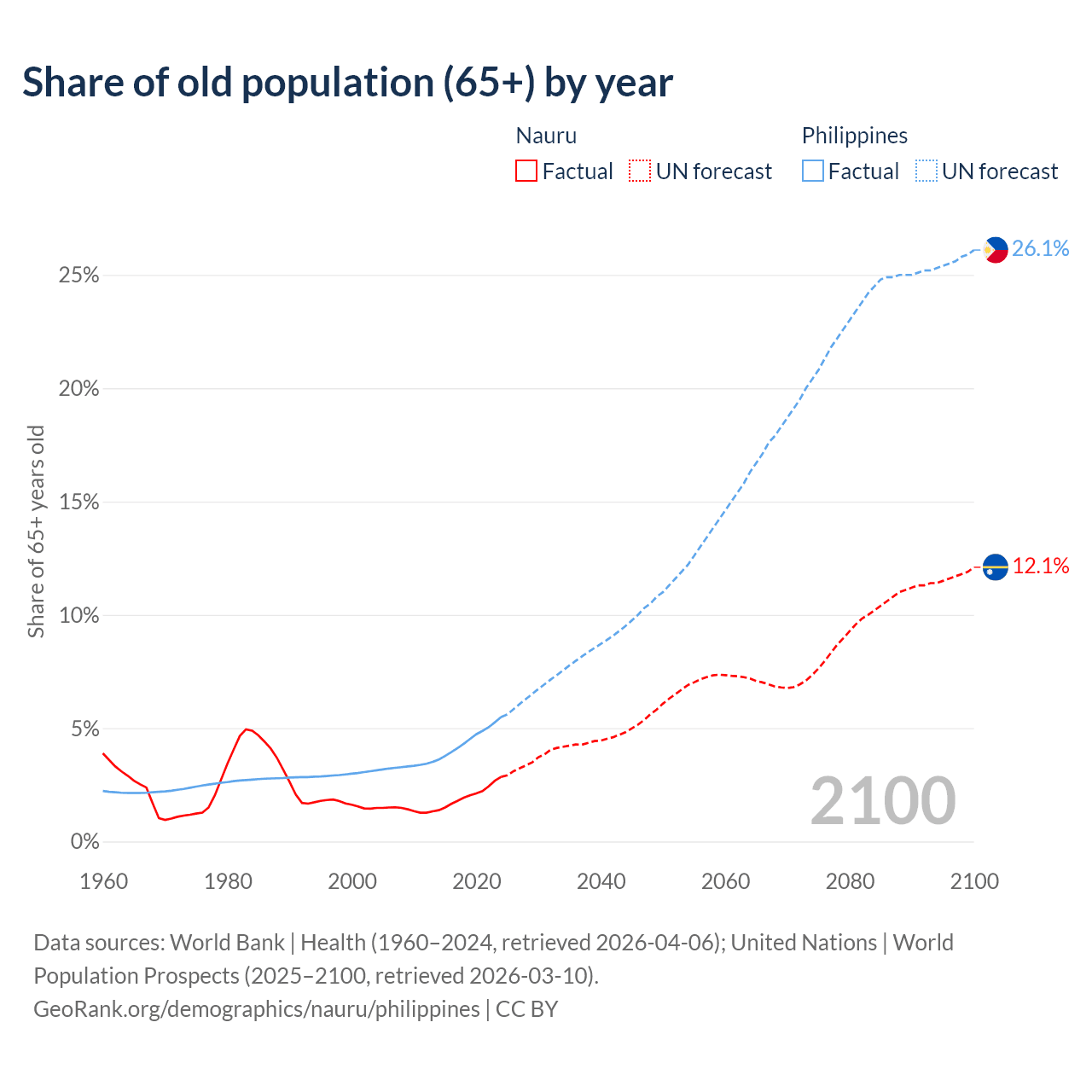 - The share of old-age demographic (65+) in Nauru is 2.85% vs 5.49% in the Philippines.