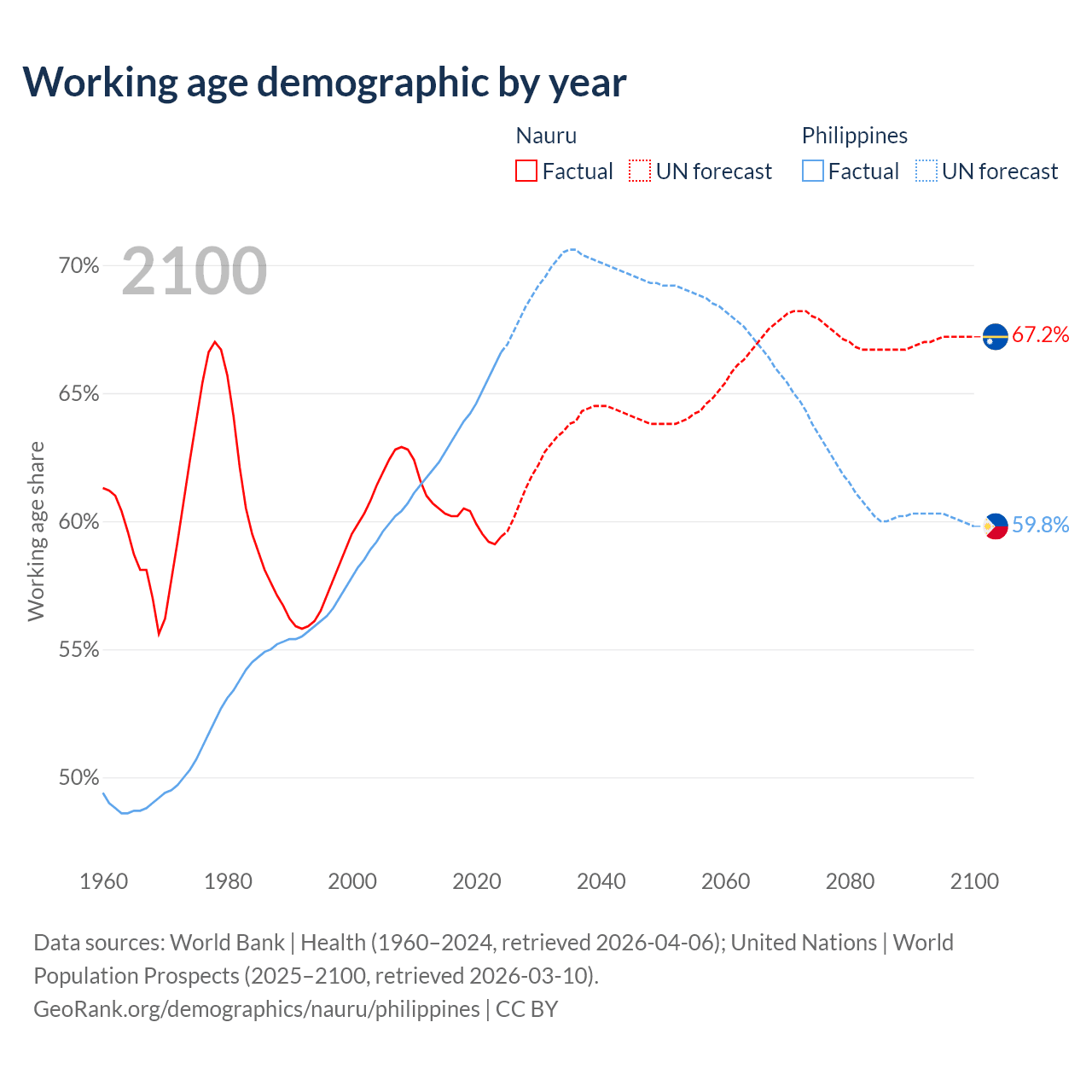 - Nauru has 7.2K working age adults (aged 15-64) vs 78.6M in the Philippines.