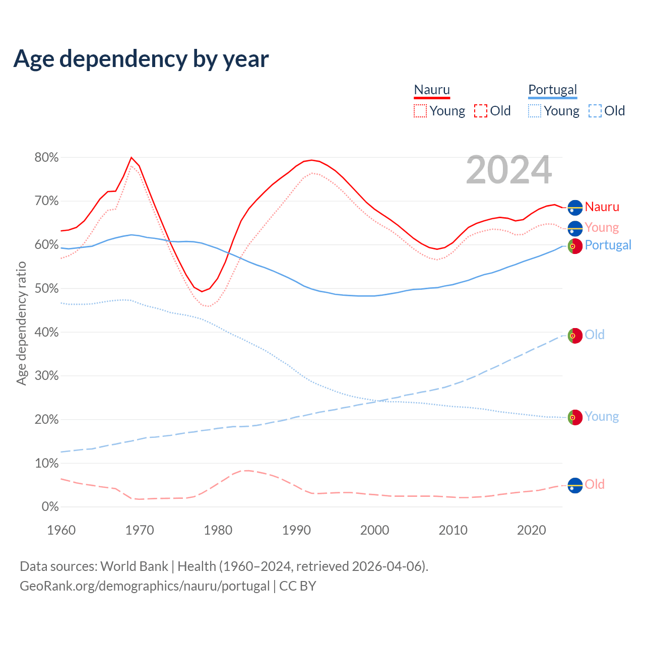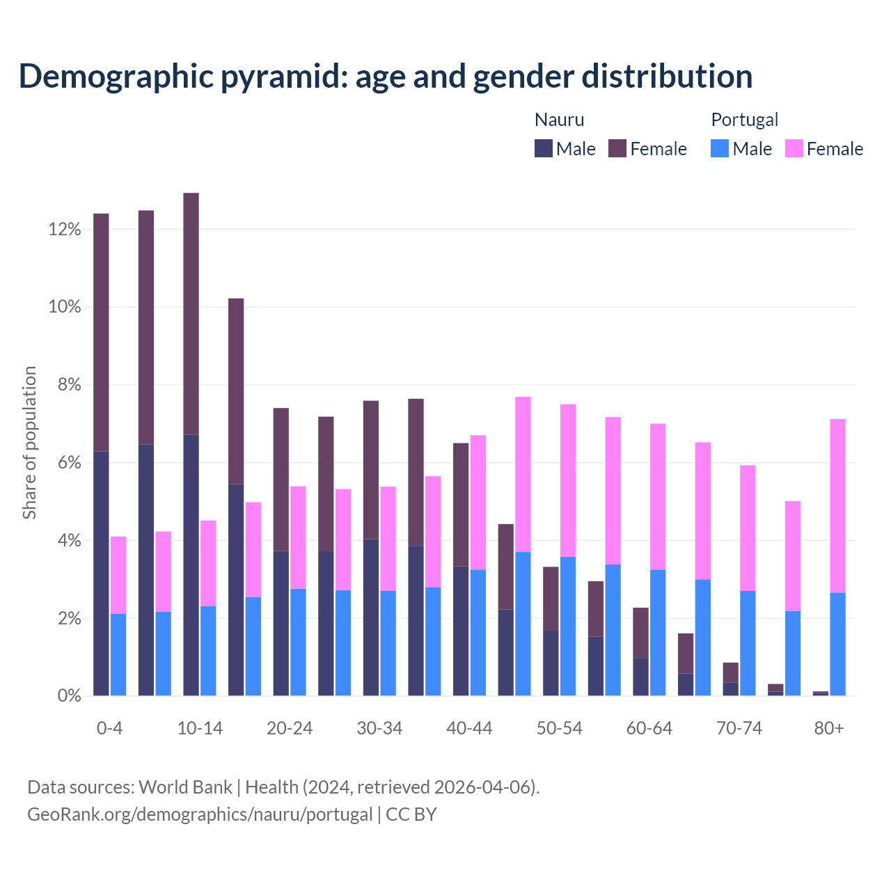 - Nauru is ranked 155/196 by median age (oldest to youngest) vs 5/196 for Portugal.