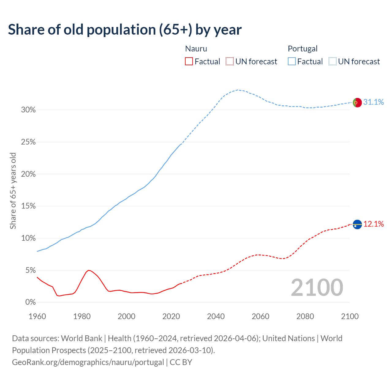 The share of older people aged 65 and over is 2.85% in Nauru and 24.5% in Portugal. Life expectancy in Nauru compared to Portugal .