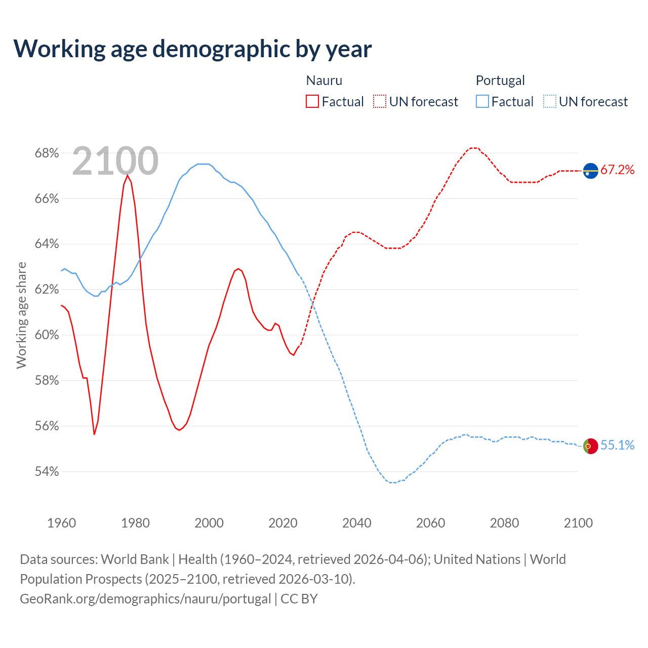 - Nauru has 7.2K working age adults (aged 15-64) vs 6.68M in Portugal.