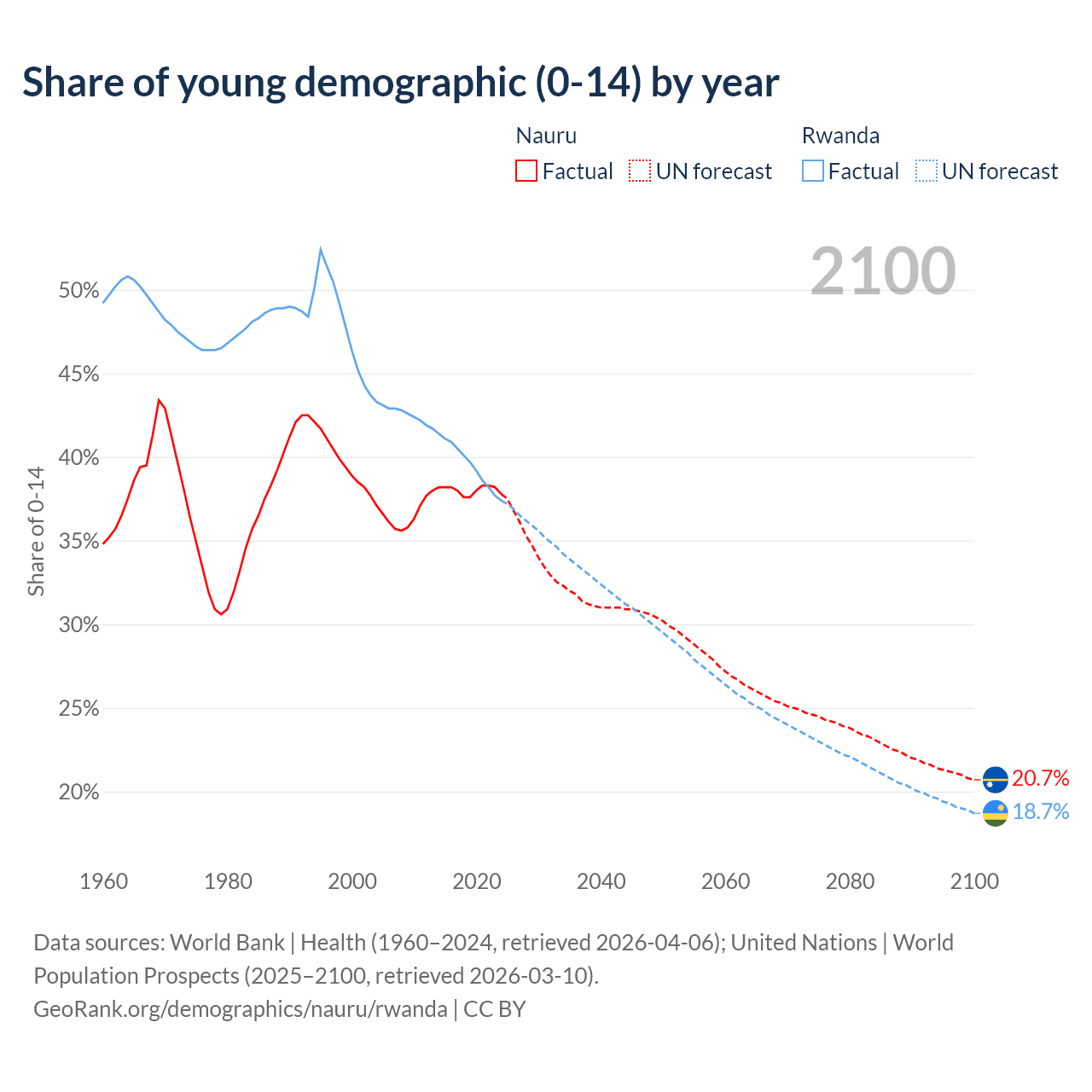 - The share of young demographic (0-15 years old) in Nauru is 37.8% vs 37.4% in Rwanda.
