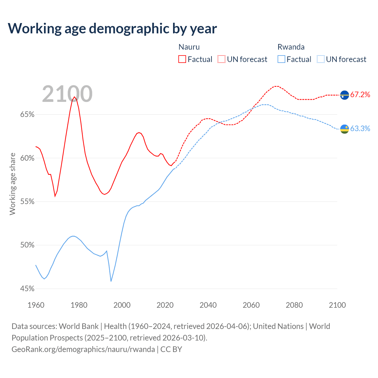 - The share of old-age demographic (65+) in Nauru is 2.85% vs 3.93% in Rwanda.