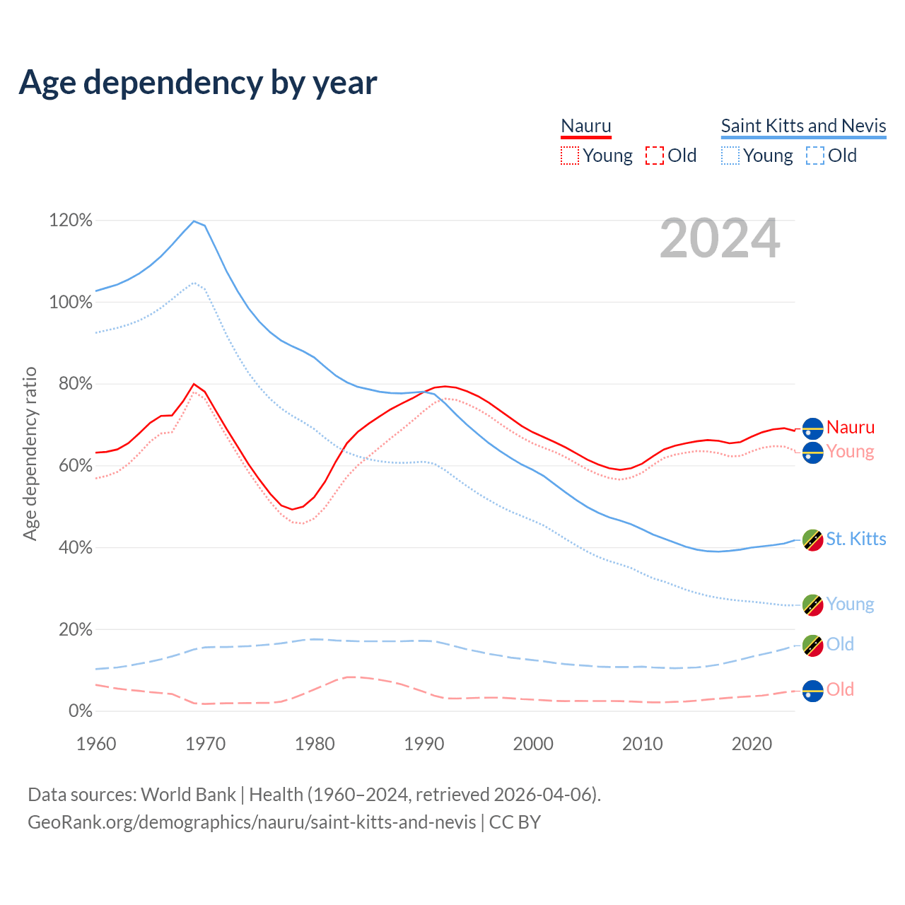 - The share of old-age demographic (65+) in Nauru is 2.85% vs 11.2% in Saint Kitts and Nevis.
