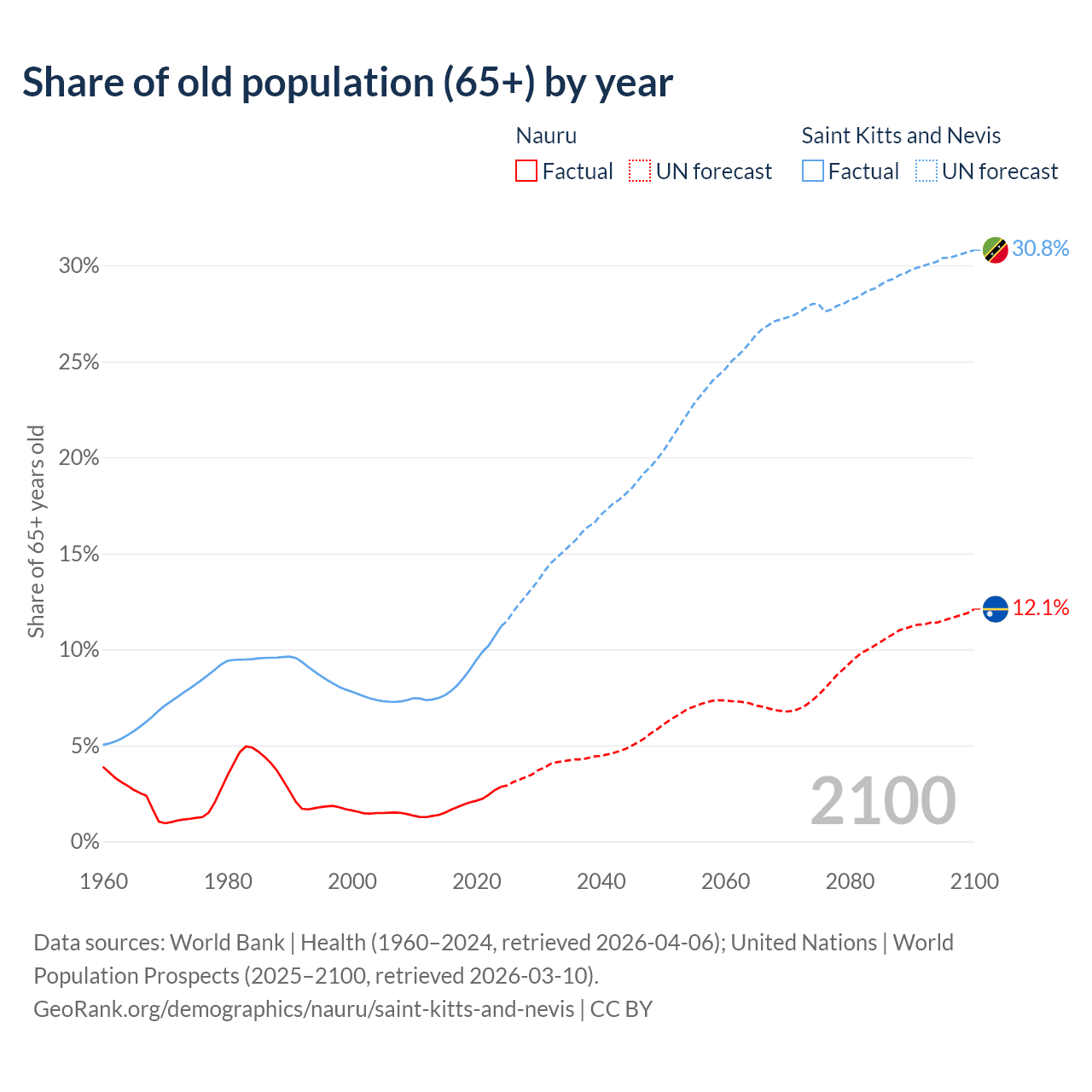 The share of older people aged 65 and over is 2.85% in Nauru and 11.2% in Saint Kitts and Nevis. Life expectancy in Nauru compared to Saint Kitts and Nevis .