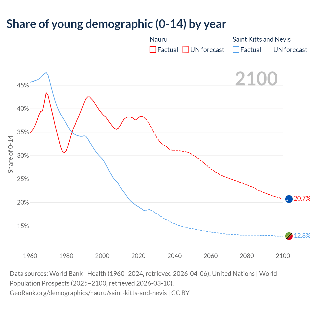- The share of young demographic (0-15 years old) in Nauru is 37.8% vs 18.2% in Saint Kitts and Nevis.