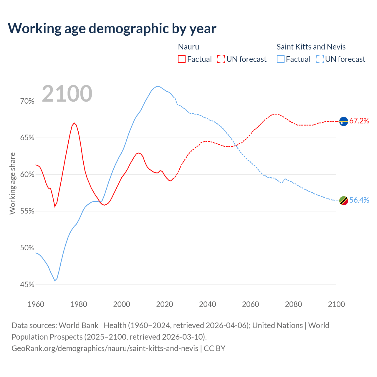 - Nauru has 7.2K working age adults (aged 15-64) vs 33.2K in Saint Kitts and Nevis.