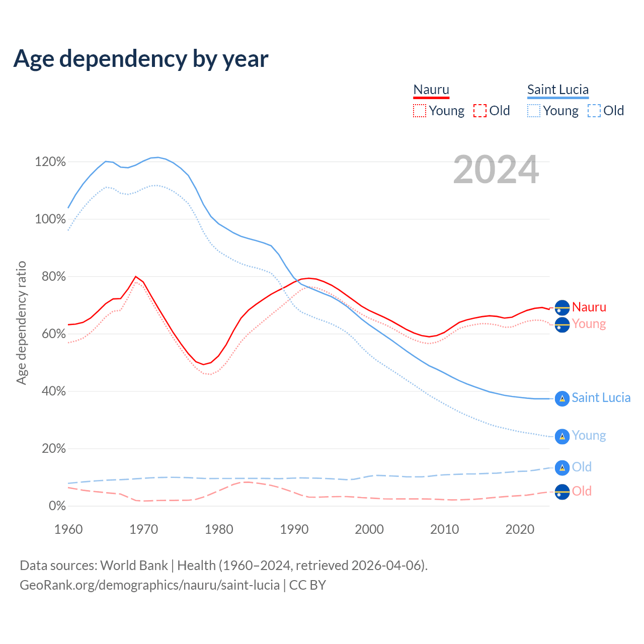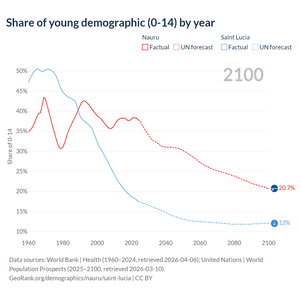 - The share of young demographic (0-15 years old) in Nauru is 37.8% vs 17.5% in Saint Lucia.