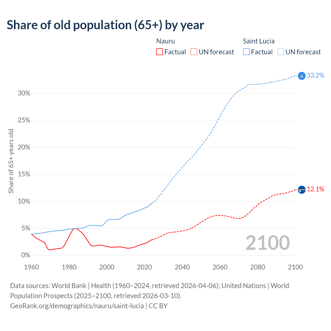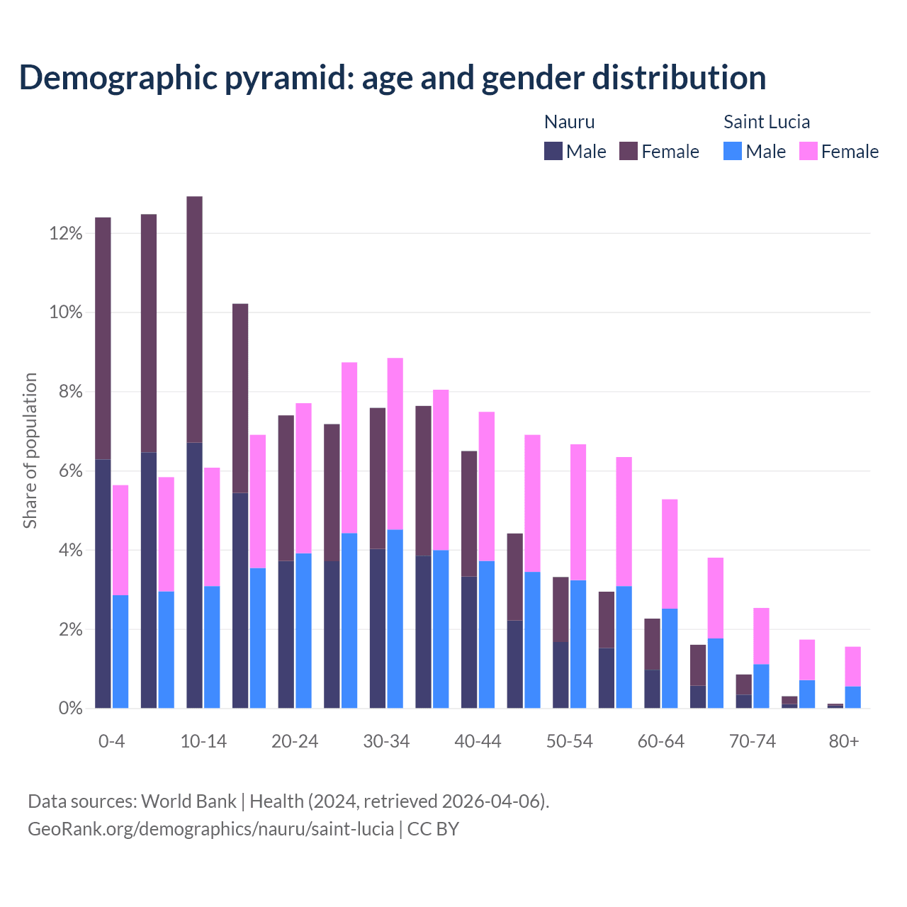 - The share of old-age demographic (65+) in Nauru is 2.85% vs 9.62% in Saint Lucia.