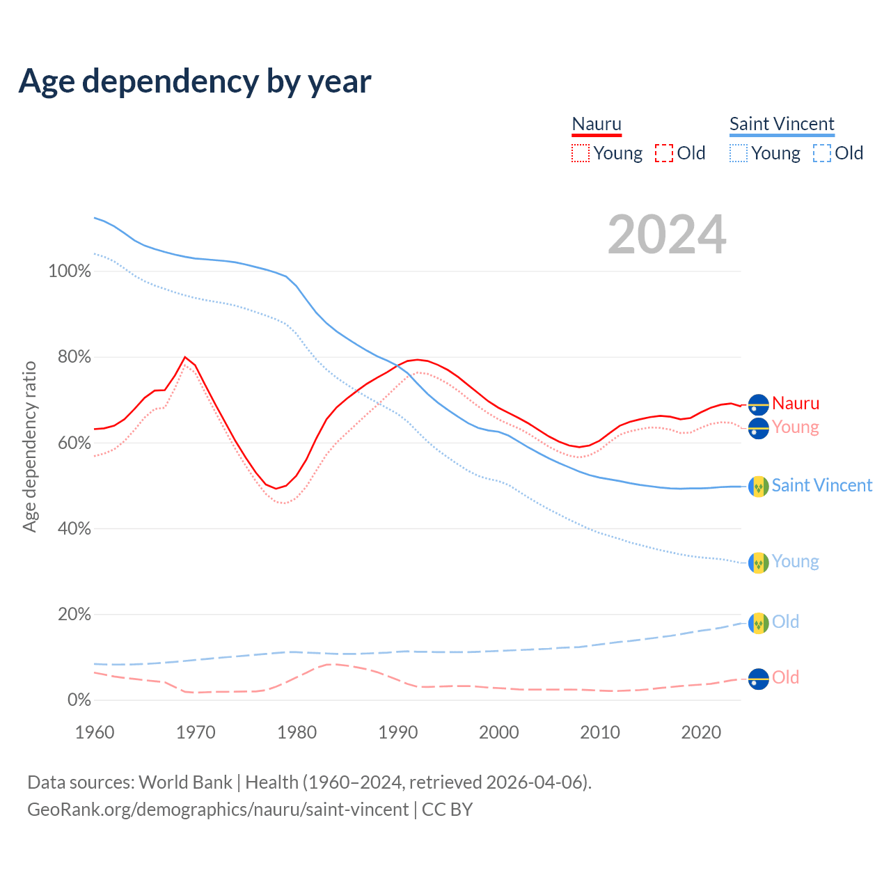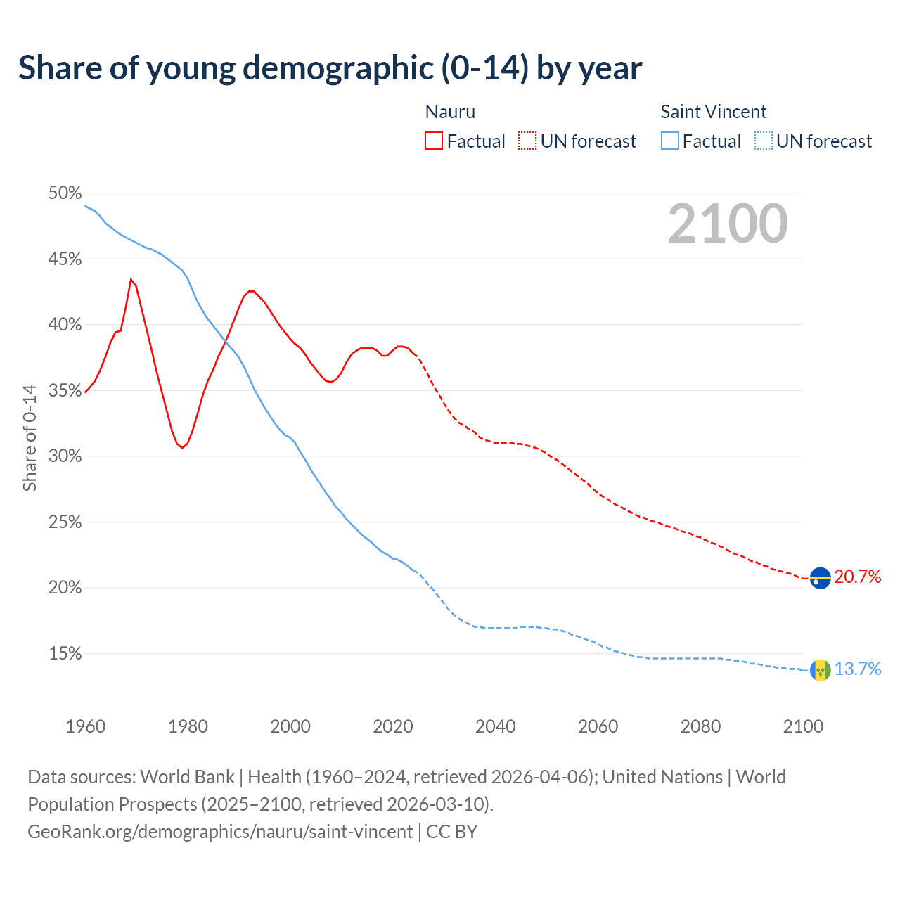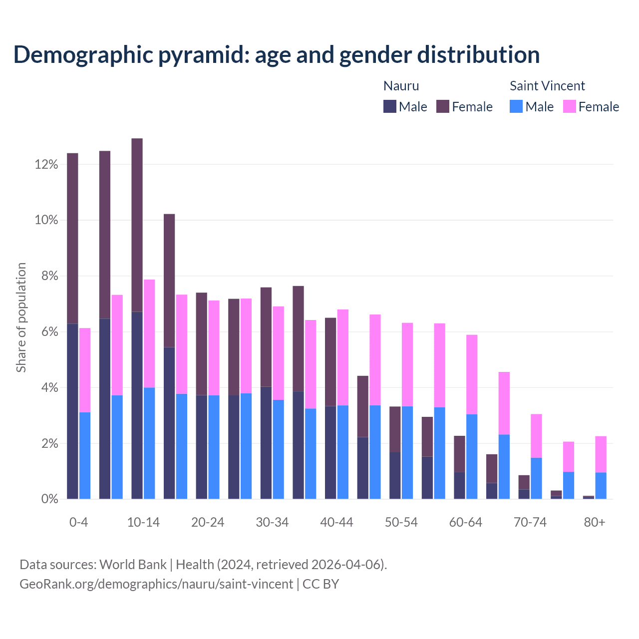 - The share of young demographic (0-15 years old) in Nauru is 37.8% vs 21.3% in Saint Vincent.