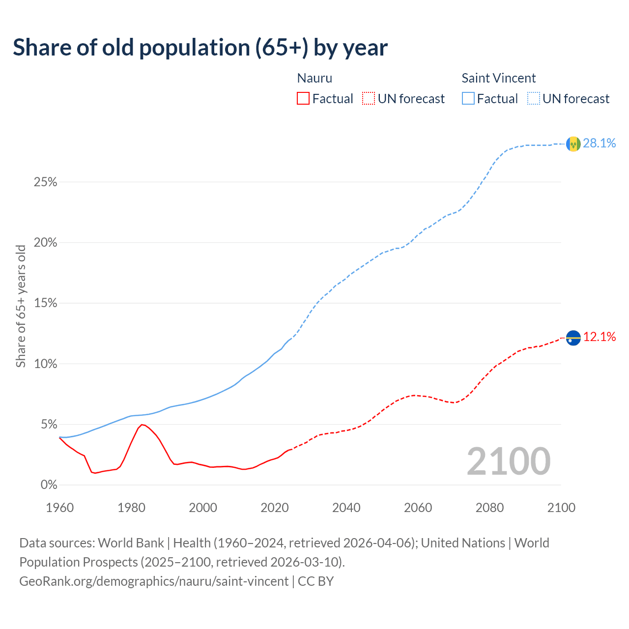 - The share of old-age demographic (65+) in Nauru is 2.85% vs 11.9% in Saint Vincent.