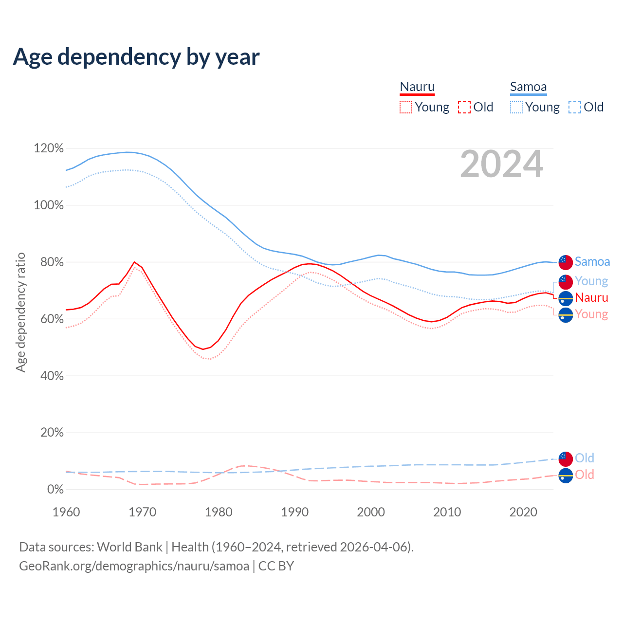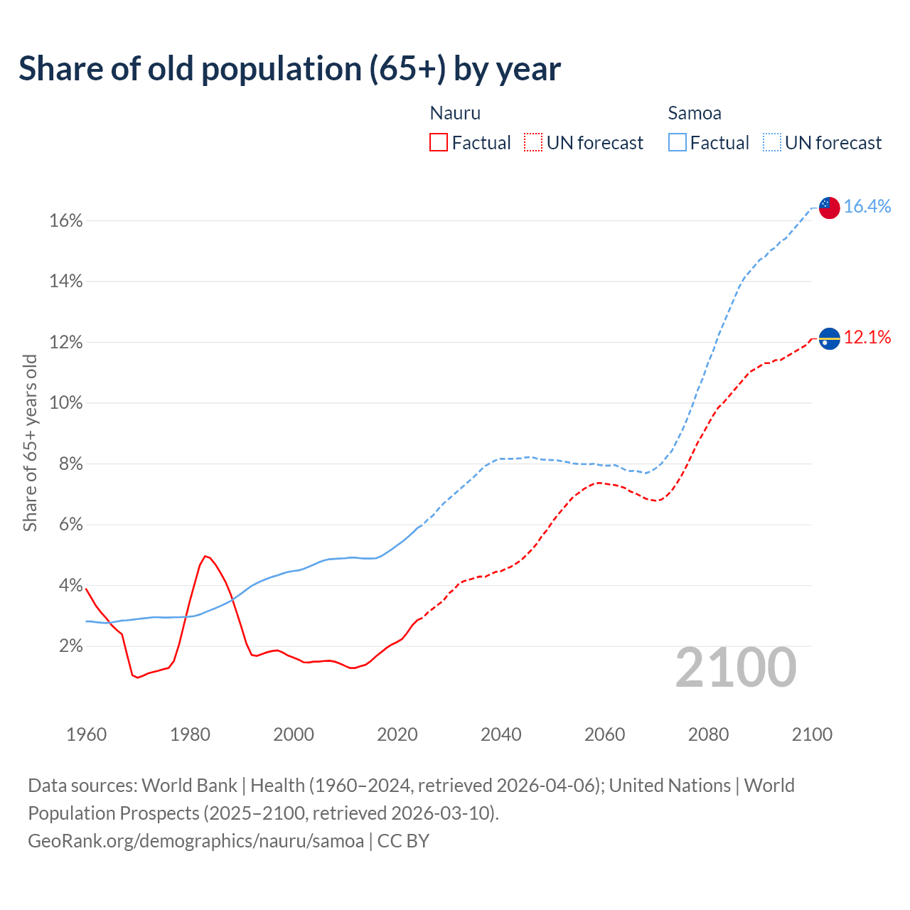 - The share of old-age demographic (65+) in Nauru is 2.85% vs 5.88% in Samoa.