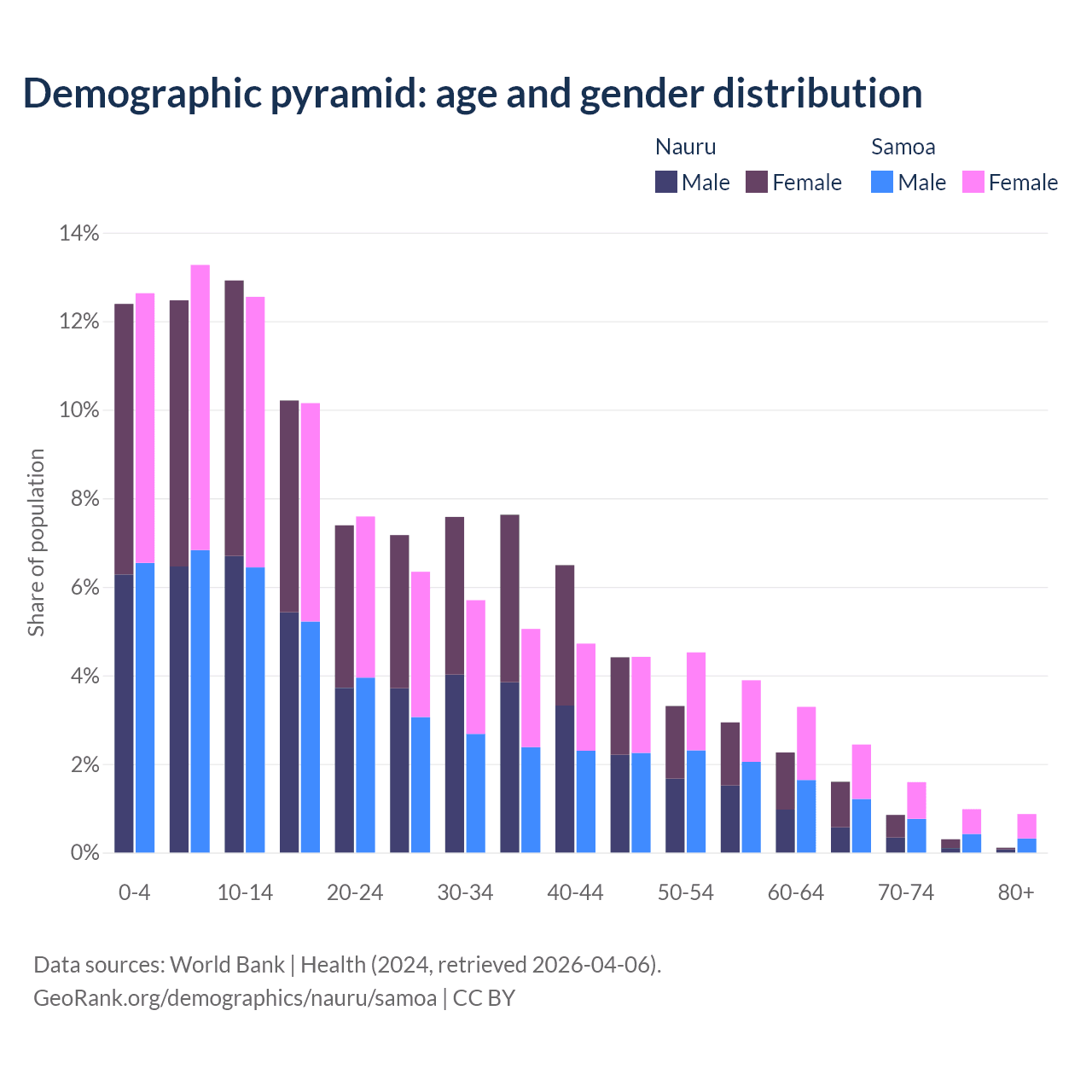 - Nauru is ranked 155/196 by median age (oldest to youngest) vs 158/196 for Samoa.