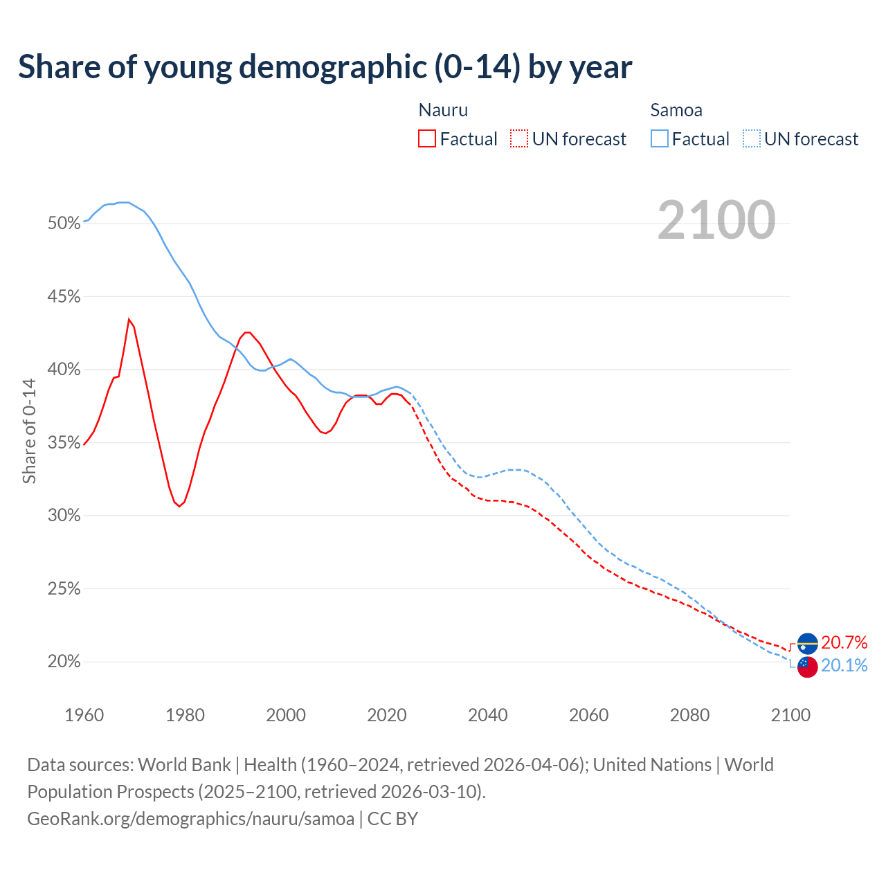 - The share of young demographic (0-15 years old) in Nauru is 37.8% vs 38.5% in Samoa.