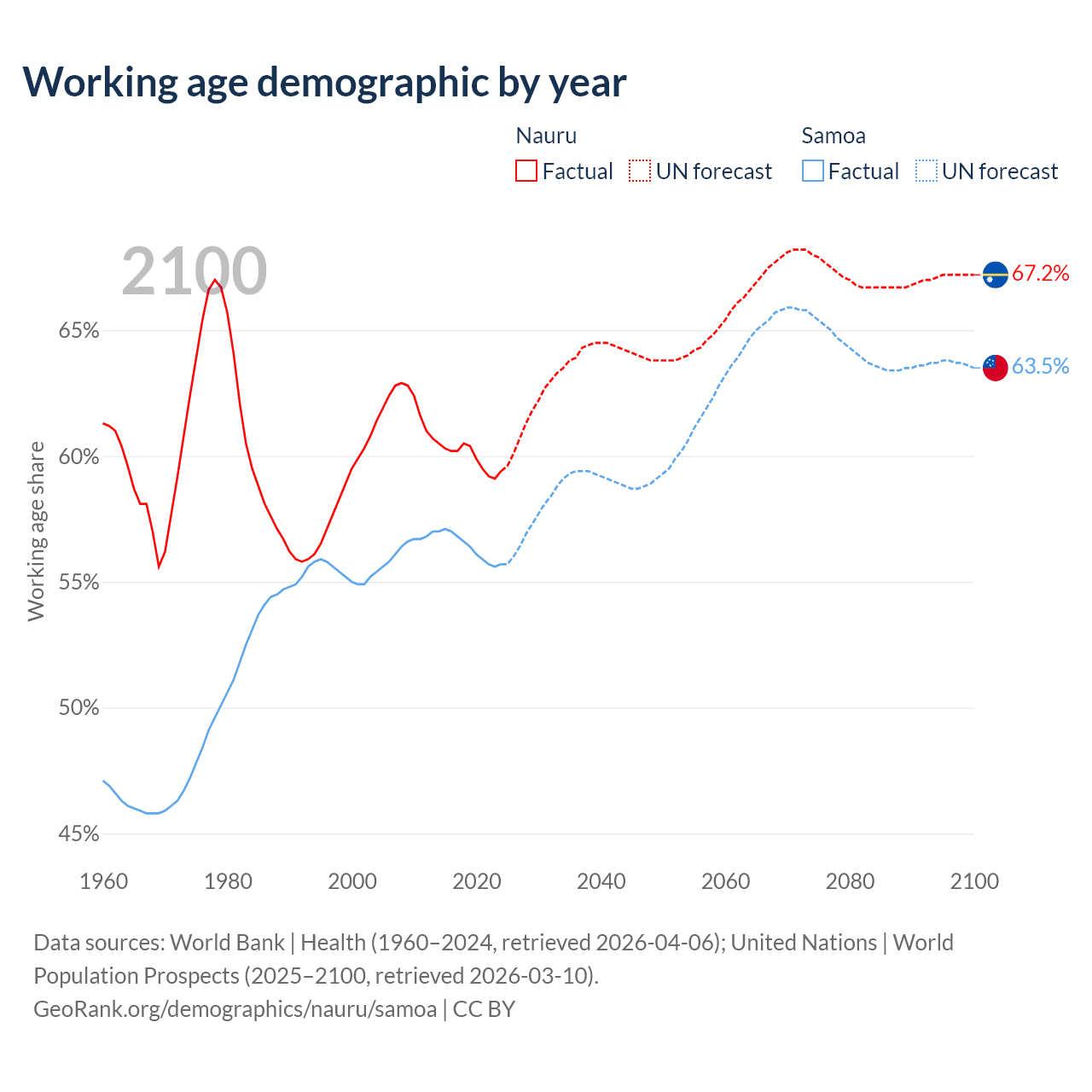 - Nauru has 7.2K working age adults (aged 15-64) vs 123K in Samoa.