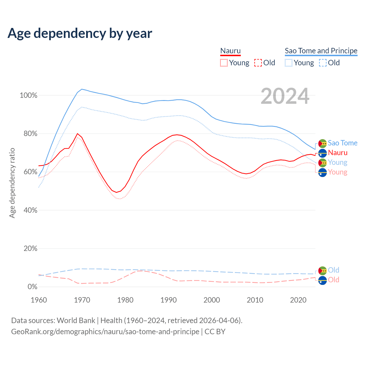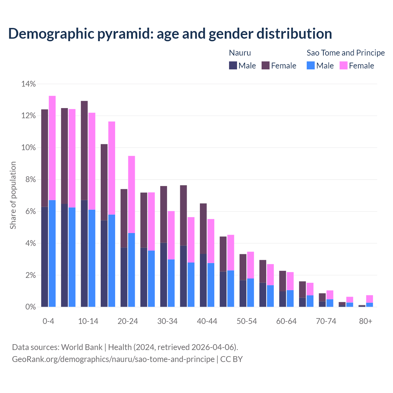 - Nauru is ranked 155/196 by median age (oldest to youngest) vs 163/196 for Sao Tome and Principe.