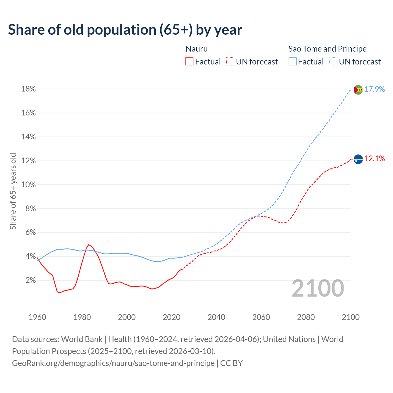 The share of older people aged 65 and over is 2.85% in Nauru and 3.9% in Sao Tome and Principe. Life expectancy in Nauru compared to Sao Tome and Principe .