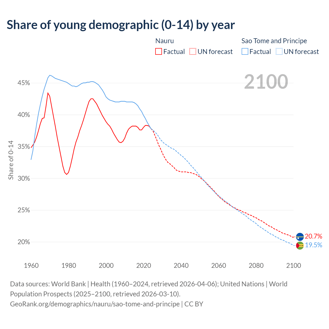- The share of young demographic (0-15 years old) in Nauru is 37.8% vs 37.8% in Sao Tome and Principe.
