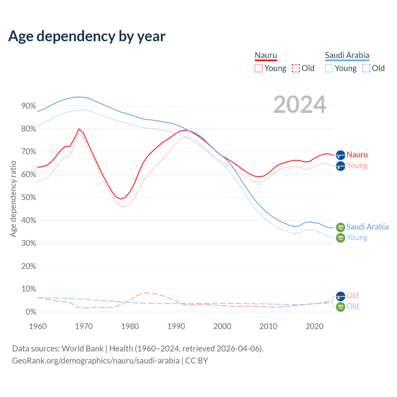 - Nauru is ranked 155/196 by median age (oldest to youngest) vs 98/196 for Saudi Arabia.
