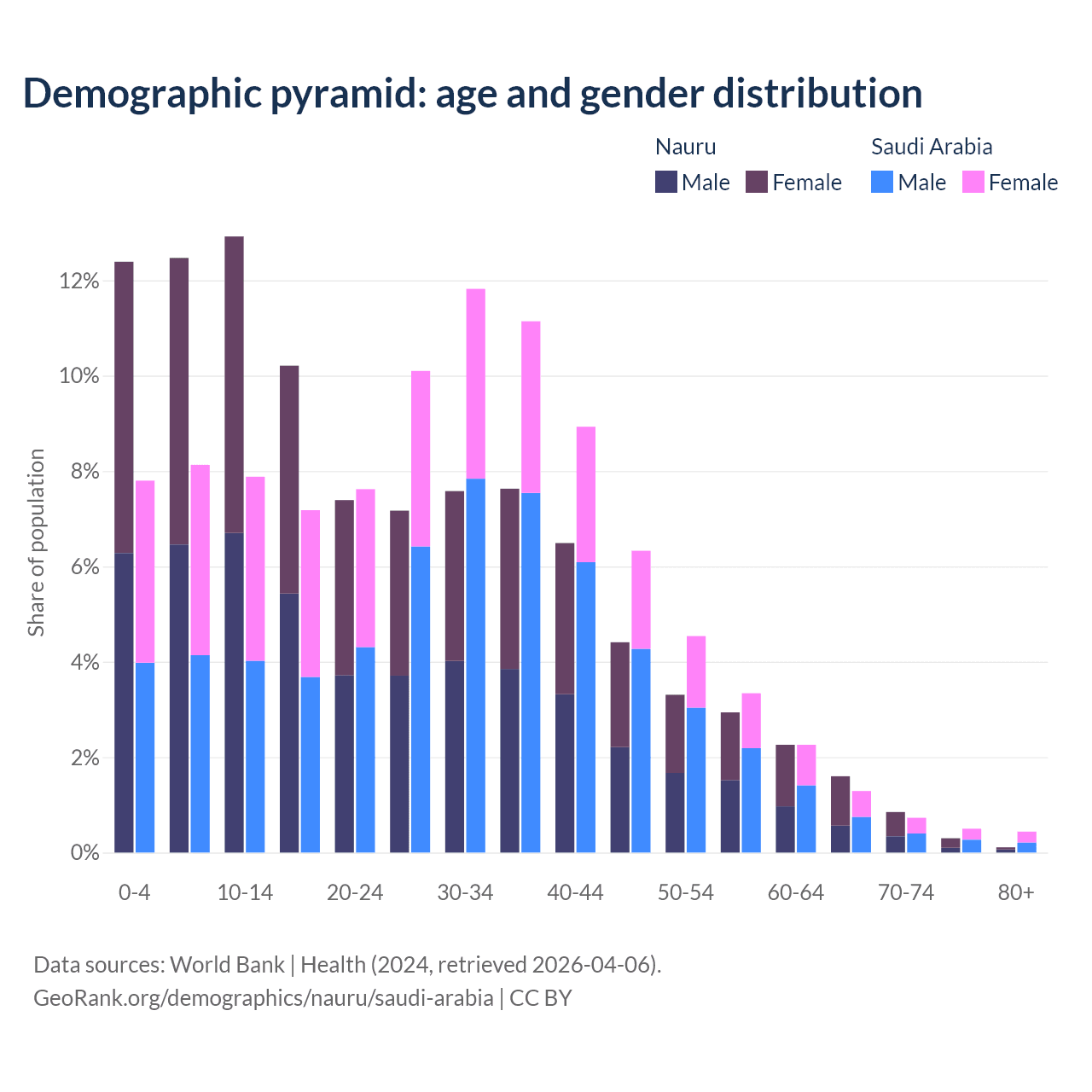 - The median age in Nauru is 21.4 years compared to 30.5 years in Saudi Arabia.