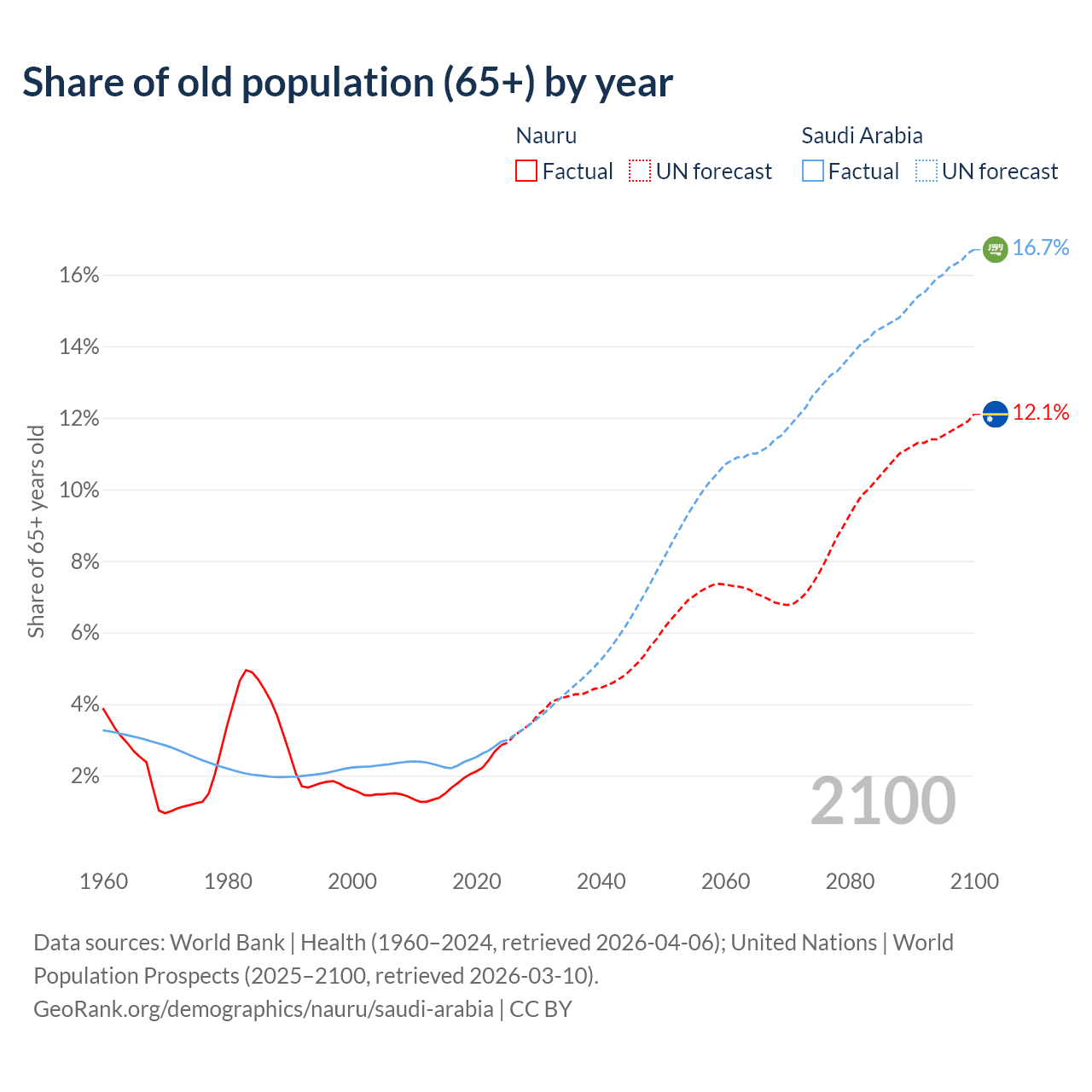 The share of older people aged 65 and over is 2.85% in Nauru and 2.95% in Saudi Arabia. Life expectancy in Nauru compared to Saudi Arabia .